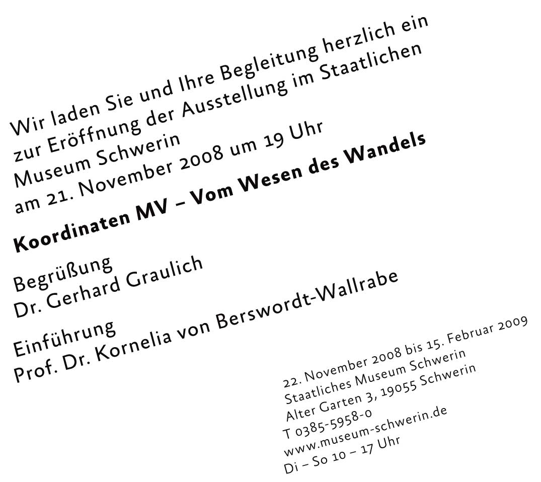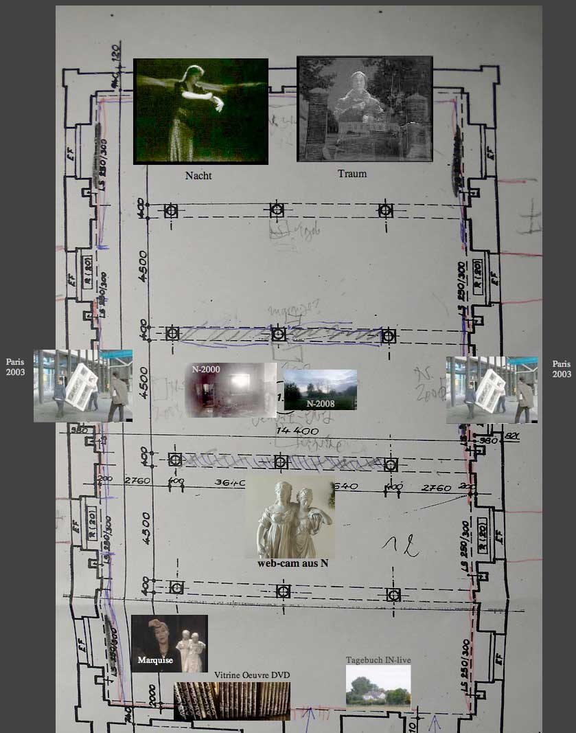 Als ich vor acht Jahren das Haus der Kindheit, elf Jahre nach dem Fall der Mauer, wiedersah, war es zugemmauert, alle Fenster und Türen zu, eine Seitentür aufgebrochen , im Dach, damit es reinregnete, ein Loch zum Himmel. Zu Füssen und rundum die niedergerissenen Ställe und Nebengebäude, das Haus selbst dem Abriss bestimmt. Alles eine Mauer der wüsten Leere wie das Nichts. Und wenn wir in Schwerin nun einen grossen Raum zeigen mit Projektionen von Filmen aus der Zeit als dies alles verloren war (Die Nacht/1985) und wieder betreten noch weiter weg und endgültig abzuschreiben(Ein Traum, was sonst 1994), mit Gängen der ersten Wiederbegegnung durchs Haus( auf Band 2000), wieder erworben(2003 Paris mit neuen Filmen) und nicht wieder herstellbar erschien , so bleiben sollte als Monument des Verlusts, aber un wieder davon Besitz ergriffen (2008 durchs selbe Haus gehend wie 2000 mit der Kamera ), wie sollen wir das nennen, diesen Raum, das er zeigt, im Zusammenhang dessen, was sonst im Leben getan. Vorstellung und Realität, Kunst und Wirklichkeit? Die live Kamera aus N. gemahnt des Tages Rechte nach soviel Nacht und Träumen.