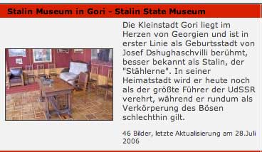 Seit Tagen wird in den Nachrichten berichtet und dementiert, dass russische Truppen in Gori einmarschiert seien. Der Geburtsort Stalins. Der Russland an der Spitze der SU gross gemacht. Nun ausserhalb Russlands? Er hatte sein Geburtshaus in einen Tempel setzen lassen. Inmitten eines Parks.