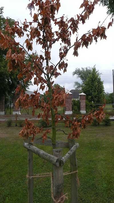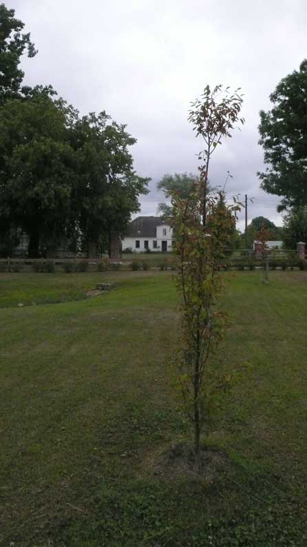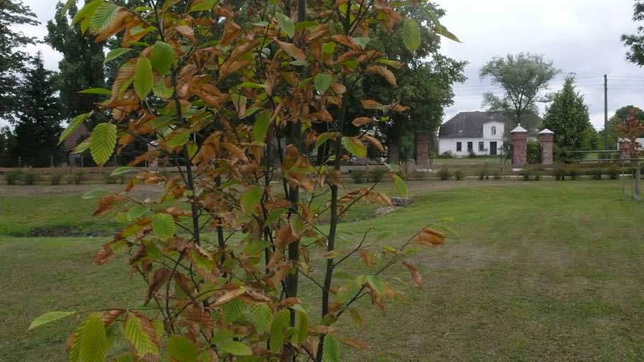 Die Anlage des Bürgermeisters über die Strasse jenseits des Hofes hier. Von 4 neugepflanzten Bäumen 2 eingetrocknet. Den einen kriegen wir vielleicht noch mal hin. Gepflanzt mit 1 Euro Jobbern, aber niemaden geschickt zu wässern, so einfach vom Kirchturm oben. An der Umsicht fehlt es immer. In zwei Genarationen verlernt.