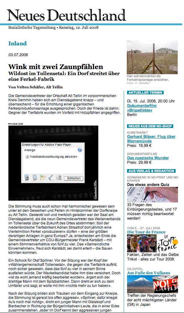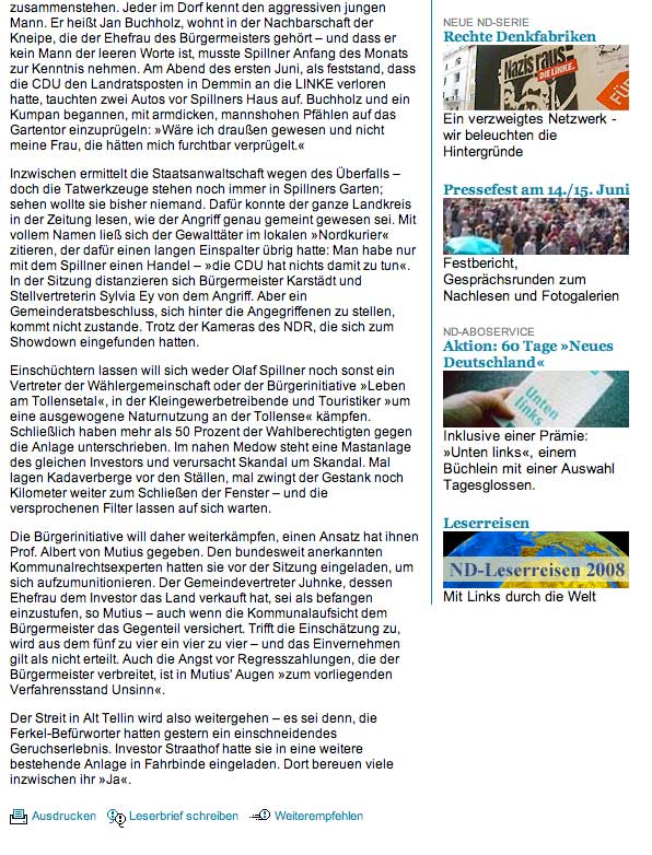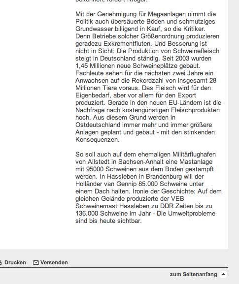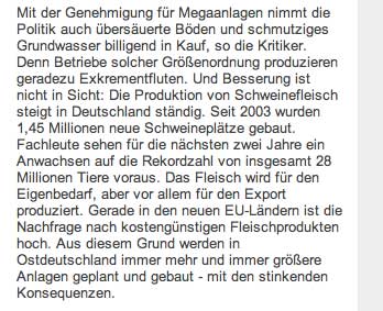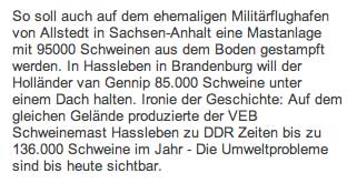 Alles rechtens, heisst es , STAUN, staatliches Amt für Natur und Umwelt geprüft, die Mängel später, zu spät, absehbar woanders 13 000 Plätze geplant, 19000 Realität, Arbeitsplätze keine, was sie in anderen Ländern nicht mehr erlauben, kommt hierher, damit was los ist, sagen alle, na endlich, die, wo es passiert, ringen die Hände, um Gottes Willen. Wir haben eine Bundeskanzlerin, die von hier kommt, die die Umweltproblemem zu Ihrer Sache gemacht hat. Und alle wissen, mit wem und was sie zu tun haben.