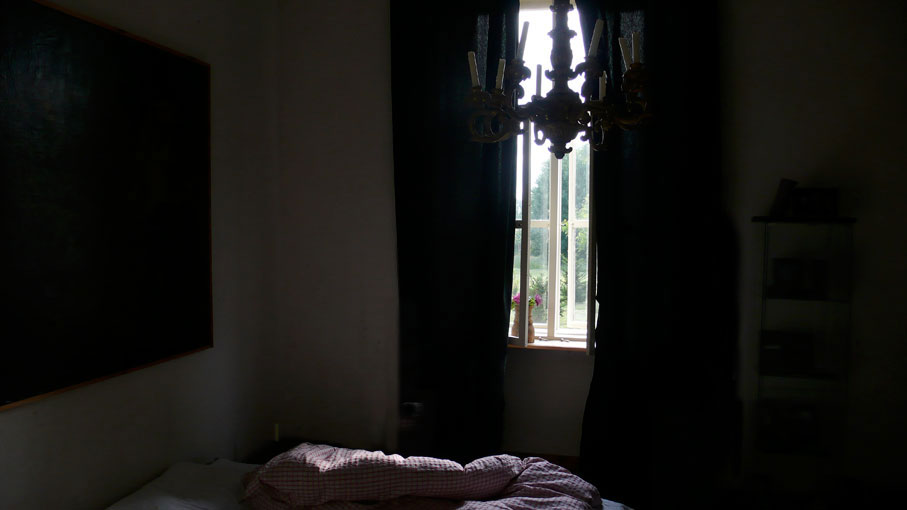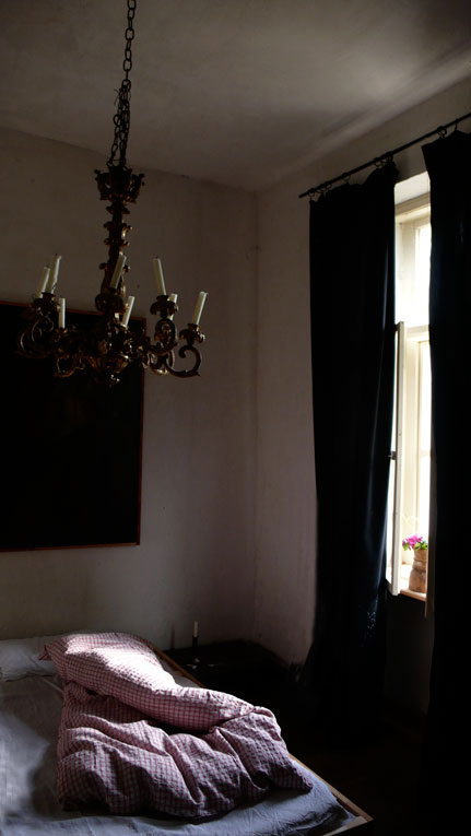 Der Blick vom Bett in das alte Schlafzimmer nun des Tisches der Morgennotizen