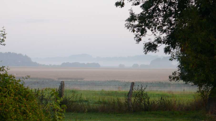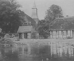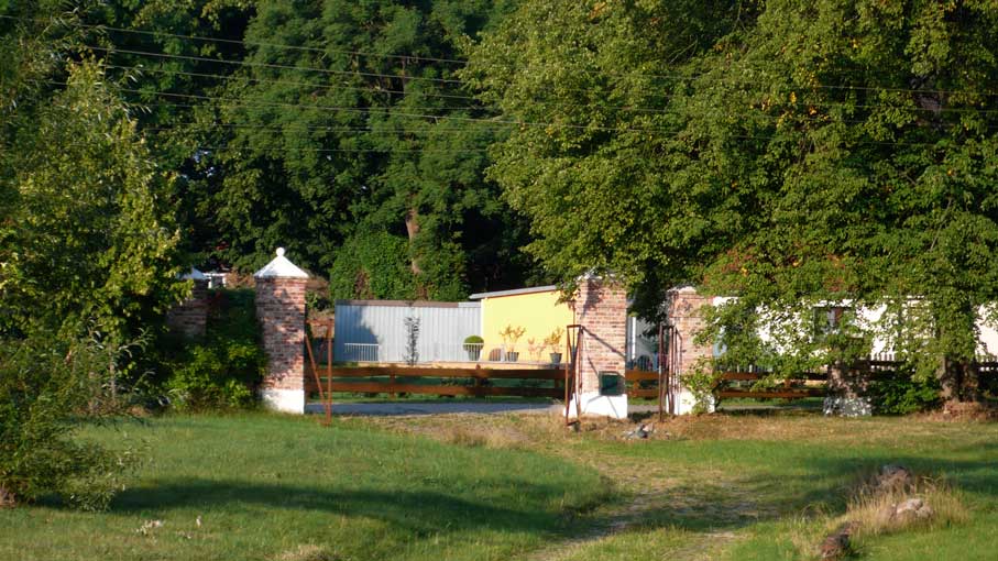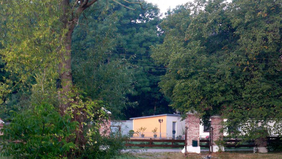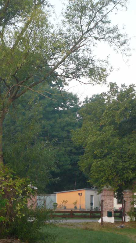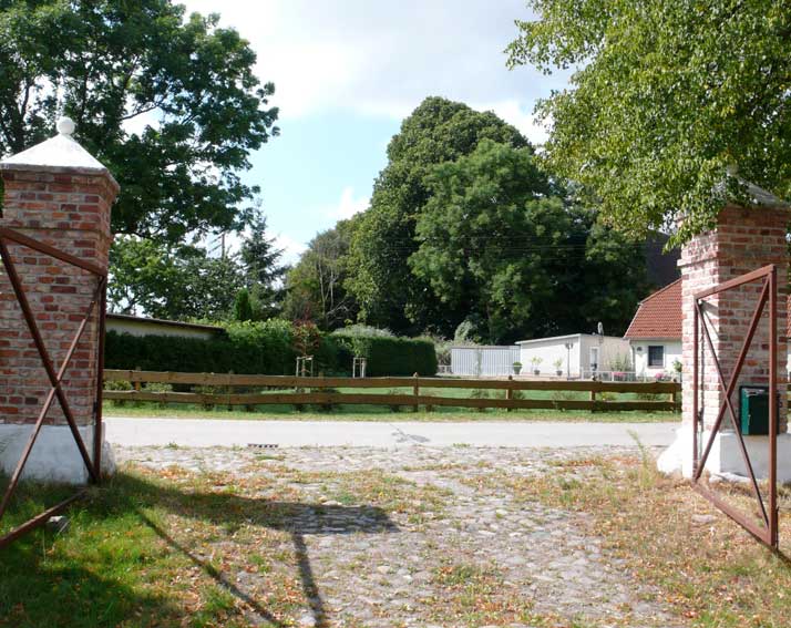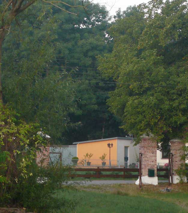 Was nach der Wende dort an Unruhe ausgestellt stattfindet, zuerst als Nebenhaus mit Pultdach über die Höhe der Wände des Wohnhauses und mit Anbau plus TV Schüssel(hinter den Blättern des Sommers)als Container für das Auto ist eine Sache für die lokale Baukommission auf schmalem Grunde alles betoniert und nun mit den Leuchtfarben eines Swinger-Clubs auf dem Dorfe, müsste als Ensembleschutz zwischen Kirche und geschütztem Gutshaus dem Denkmalsamt interessant sein.