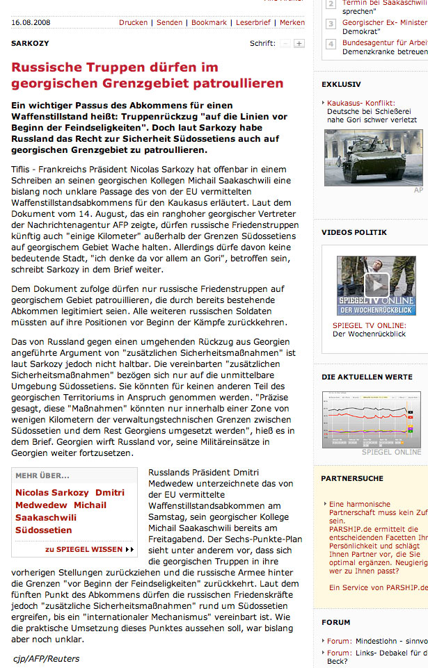 Jetzt kommts raus,Sarkozy verschenkte Georgiens Souveränität zum Anschein eigenen Erfolgs.. Wenn auch nur ein russischer Soldat legitum in Georgien erklärt wird, ist G. verloren. Und wenn die Äusserung des derzeitigen russ. Präsidenten woimmer Russen lebten und dem gesche etwas jeneits eigener Grenzen, würden sie wieder so handeln, also einmarschieren dann sind die baltischen Staaten (und was noch?) bedroht. Die amerikanischen Rakten doch ein Schutz für Polen und die Tschechen und uns oder Anlass zu solchen Vorgängen wie angekündigt. Das Risiko zu solchen Fragen ist zu gross, um sie unbeantwortet zu lassen. Besser unter russischer als amerikanisch/jüd. Hegemonie