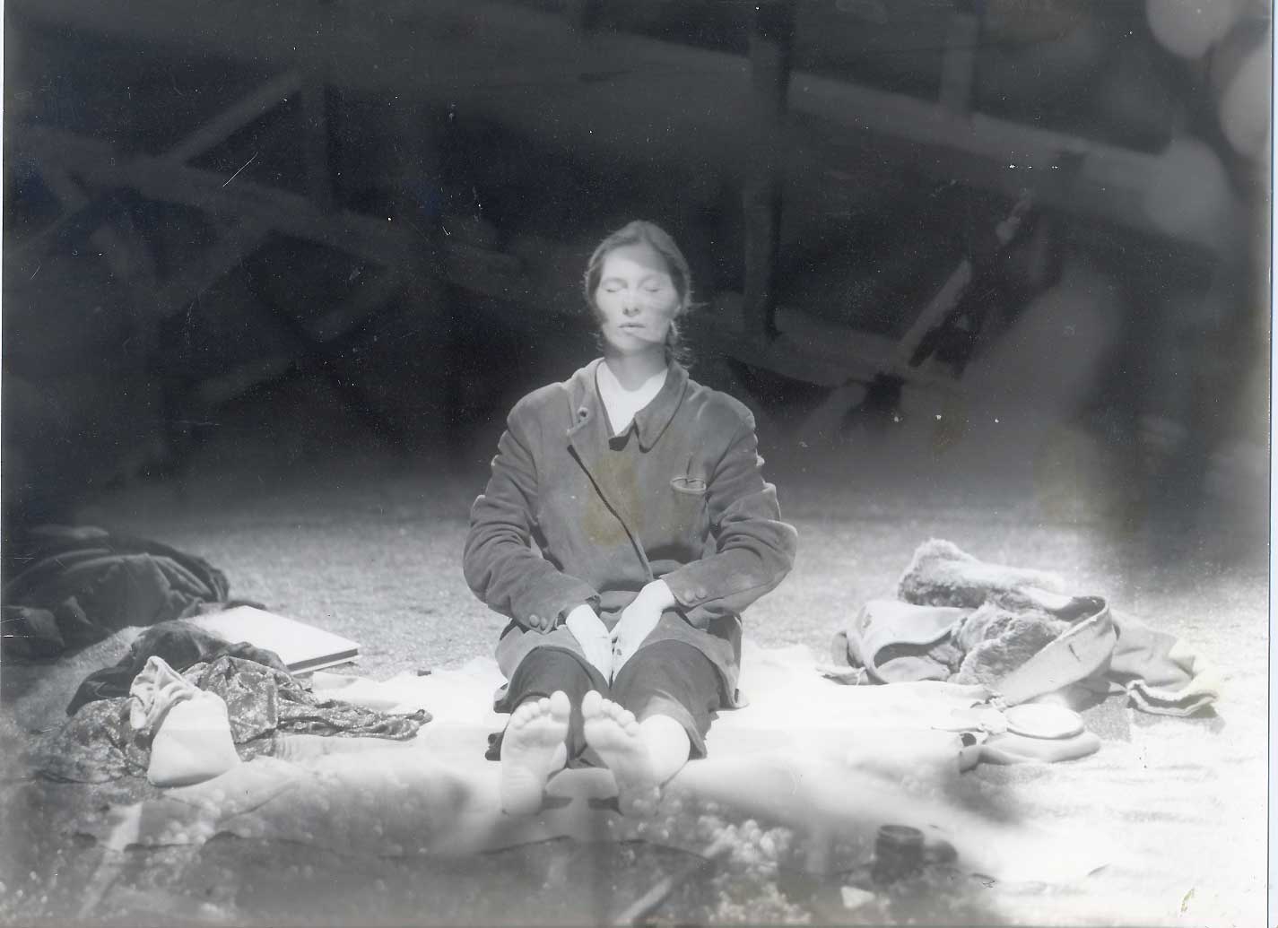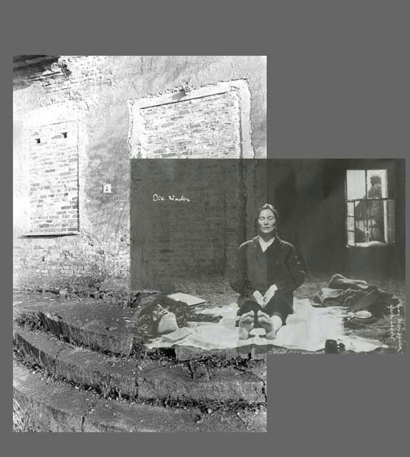 Und noch einmal -rechts- die Fassade selbst in nachtschwarzer Version mit zugemauerten Fenstern und die Nacht als Sitzende davor bedarf der Ergänzung von heute und davor.