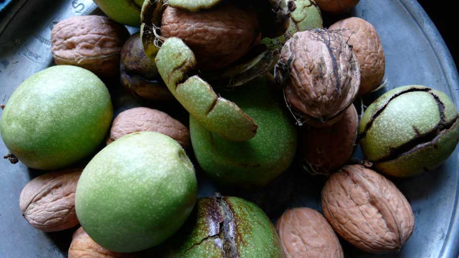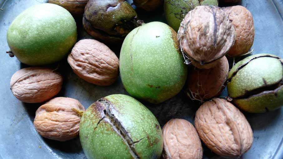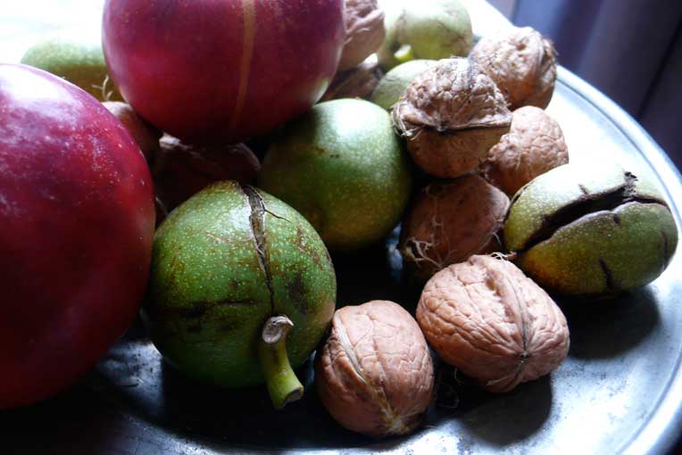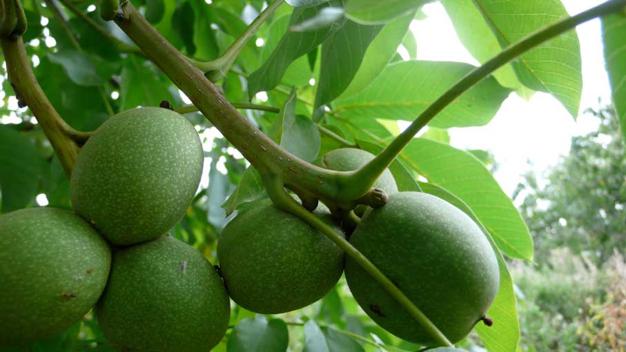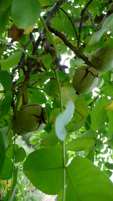 vorne und hinten, immer zwei damit es Früchte gibt, egal ob männlich oder weiblich, nur zwei müssen es sein,- aber zum ersten Mal mit schüchternen Nüssen als Dank. Sie strengen sich an, und wenn sie uns schon nicht an Grösse das liefern können, was den Baum ausmacht, Schatten und Schutz, so geben sies doch in Früchten schon jetzt.