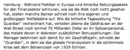 An der Wall Street stünden die Zahlungen in keinem Verhältnis zu dem Wertverlust, den die Aktien der Banken seit Jahresbeginn verzeichnen mussten, schrieb der "Guardian" weiter. Die Papiere der Citigroup und von Goldman Sachs fielen um über 45 Prozent.