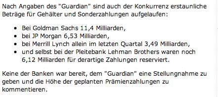 Bei den Citigroup-Mitarbeitern summierten sich die Bezüge inklusive Boni in den ersten neun Monaten dieses Jahres nach Recherchen des "Guardian" auf 25,9 Milliarden Dollar. Die Bank hatte eine Geldspritze aus dem Rettungspaket der Regierung in annähernd derselben Höhe erhalten.