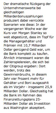 Die Titel von Merrill Lynch und Morgan Stanley gingen sogar um über 60 Prozent in den Keller. Die bisherigen Gesamtbezüge der Morgan-Stanley-Mitarbeiter von fast 10,7 Milliarden Dollar seien zwischenzeitlich sogar höher als der Börsenwert des Unternehmens gewesen.