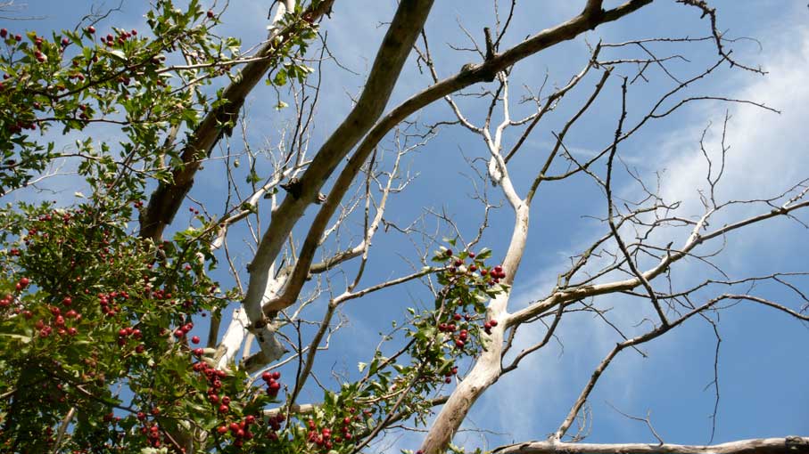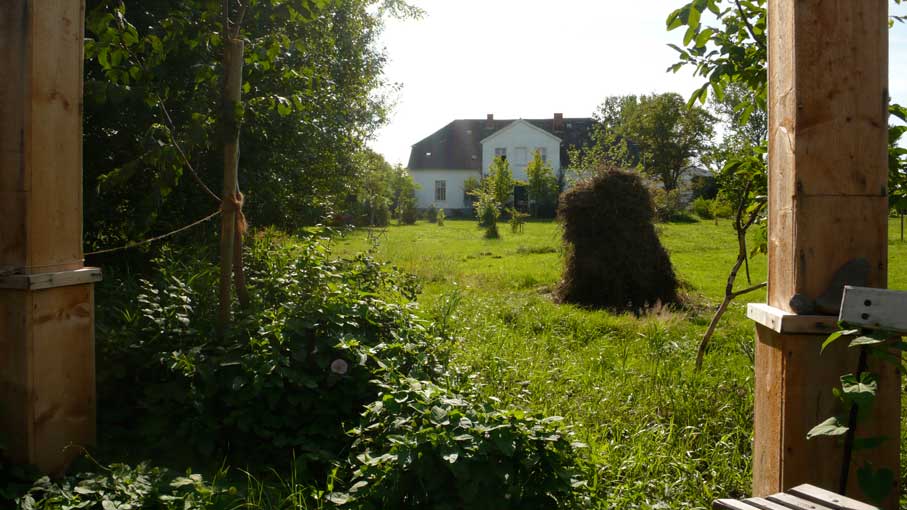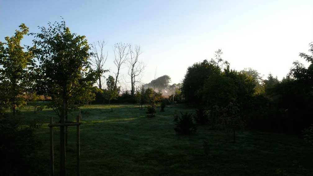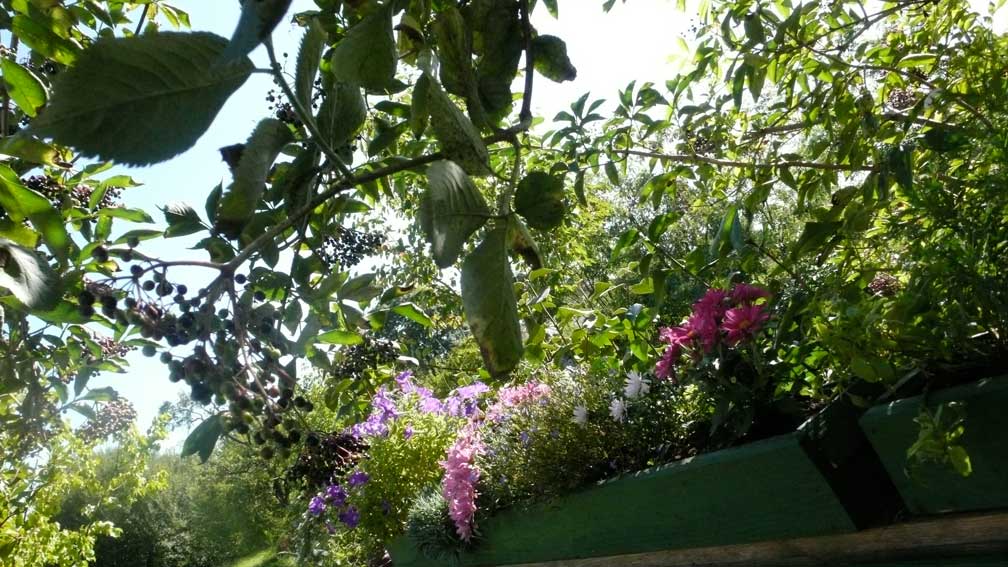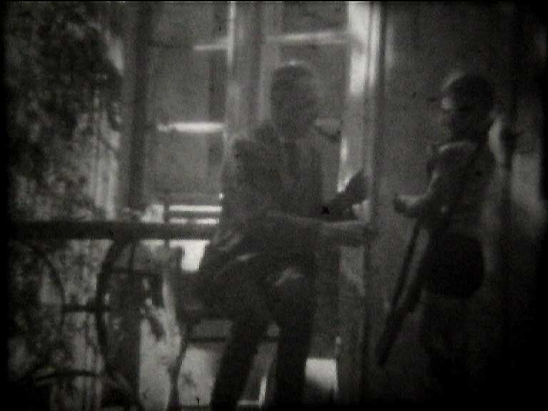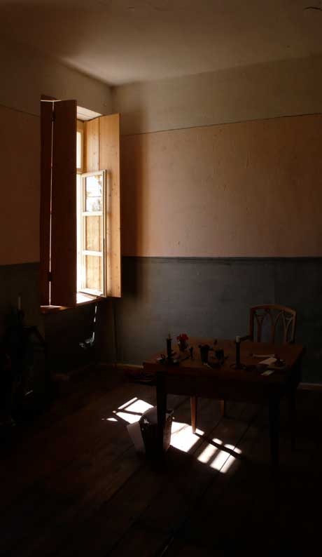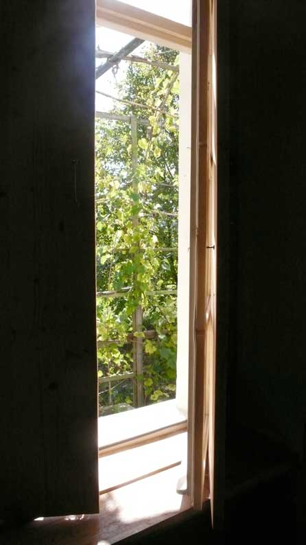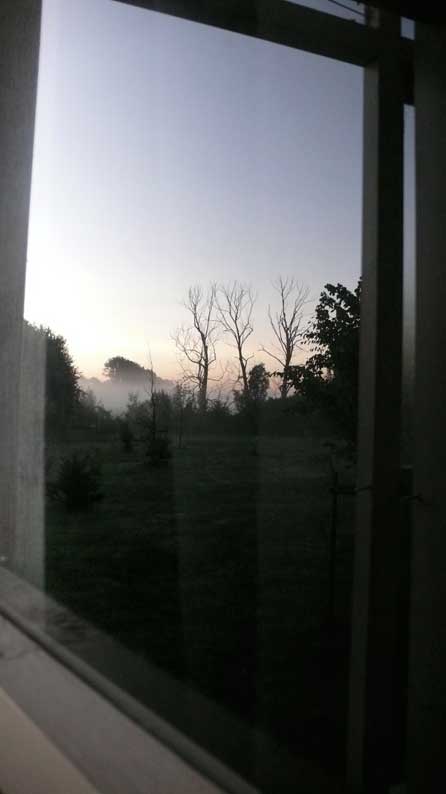 vom Bett aus gesehen, in den Scheiben des Fensters.