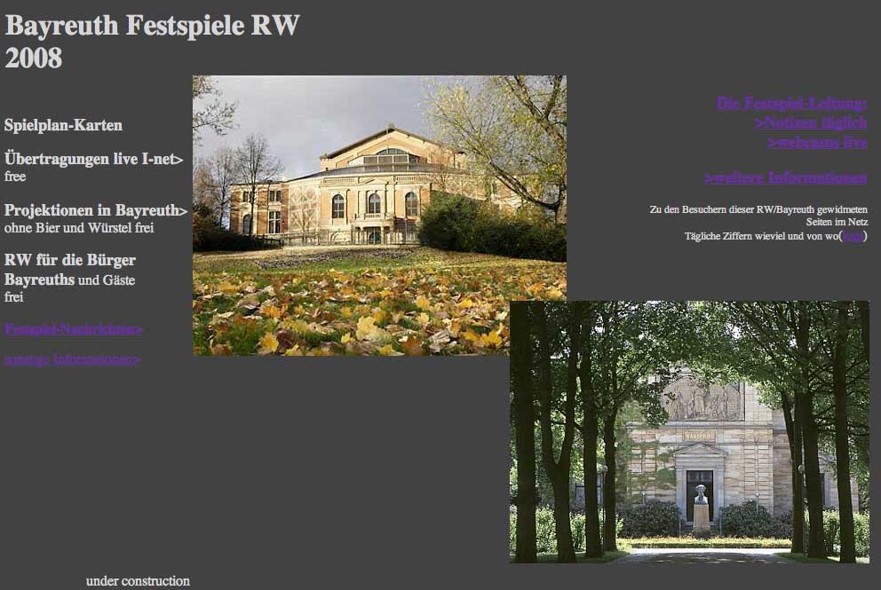 Natürlich ist diese Startseite einer Richard Wagners Bayreuth gewidmeten homepage auch ein Konzept sine cathedra. Das meint beide Gründungshäuser in Bayreuth eingebunden in das Programm, von der neuen elektronischen Technik und Ästhetik aus gesehen. In diesem Fall das Theater als Teil und abhängend von der Bestellung des Hauses (home) das seinen Wert für das Theater und die Musik ernstnimmt, wie sie aus ihm geboren sind.