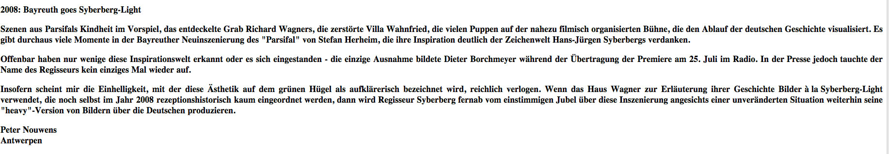 Insofern scheint mir die Einhelligkeit, mit der diese Ästhetik auf dem grünen Hügel als aufklärerisch bezeichnet wird, reichlich verlogen. Wenn das Haus Wagner zur Erläuterung ihrer Geschichte Bilder à la Syberberg-Light verwendet, die noch selbst im Jahr 2008 rezeptionshistorisch kaum eingeordnet werden, dann wird Regisseur Syberberg fernab vom einstimmigen Jubel über diese Inszenierung angesichts einer unveränderten Situation weiterhin seine "heavy"-Version von Bildern über die Deutschen produzieren.