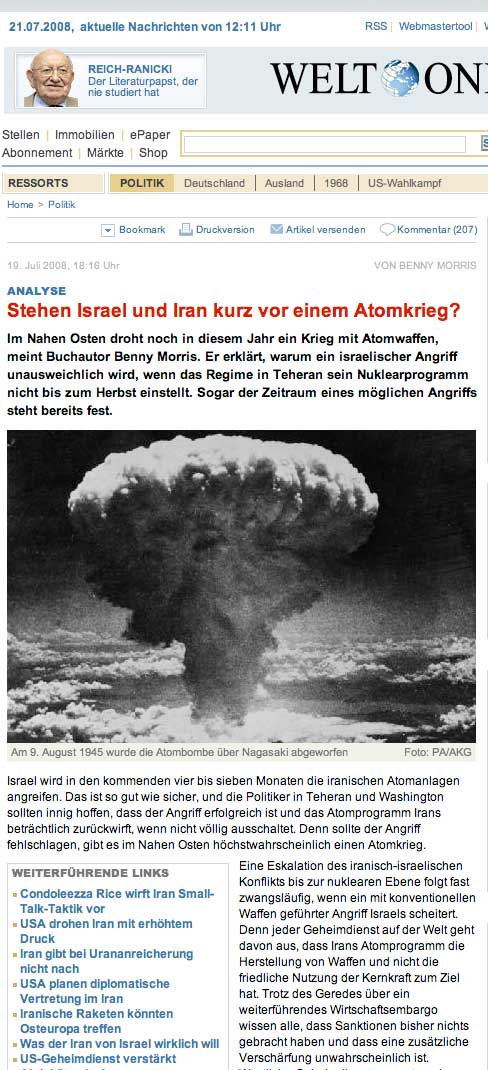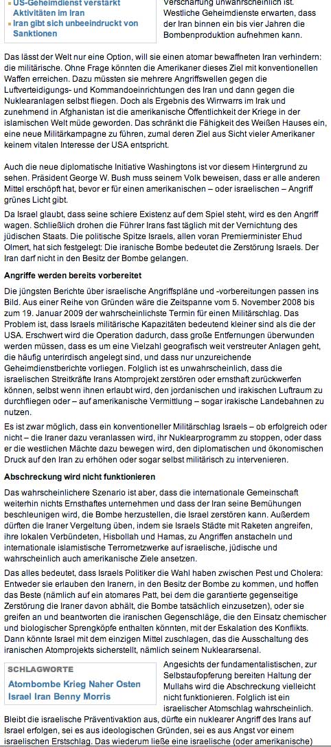 Da Israel glaubt, dass seine schiere Existenz auf dem Spiel steht, wird es den Angriff wagen. Schließlich drohen die Führer Irans fast täglich mit der Vernichtung des jüdischen Staats. Die politische Spitze Israels, allen voran Premierminister Ehud Olmert, hat sich festgelegt: Die iranische Bombe bedeutet die Zerstörung Israels. Der Iran darf nicht in den Besitz der Bombe gelangen.