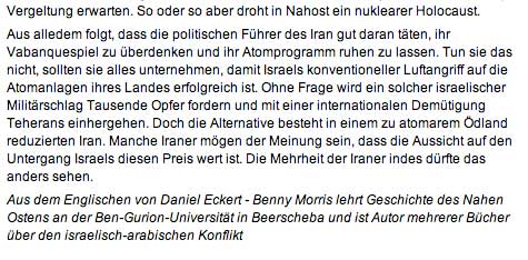 Angesichts der fundamentalistischen, zur Selbstaufopferung bereiten Haltung der Mullahs wird die Abschreckung vielleicht nicht funktionieren. Folglich ist ein israelischer Atomschlag wahrscheinlich. Bleibt die israelische Präventivaktion aus, dürfte ein nuklearer Angriff des Irans auf Israel erfolgen, sei es aus ideologischen Gründen, sei es aus Angst vor einem israelischen Erstschlag. Das wiederum ließe eine israelische (oder amerikanische) Vergeltung erwarten. So oder so aber droht in Nahost ein nuklearer Holocaust.