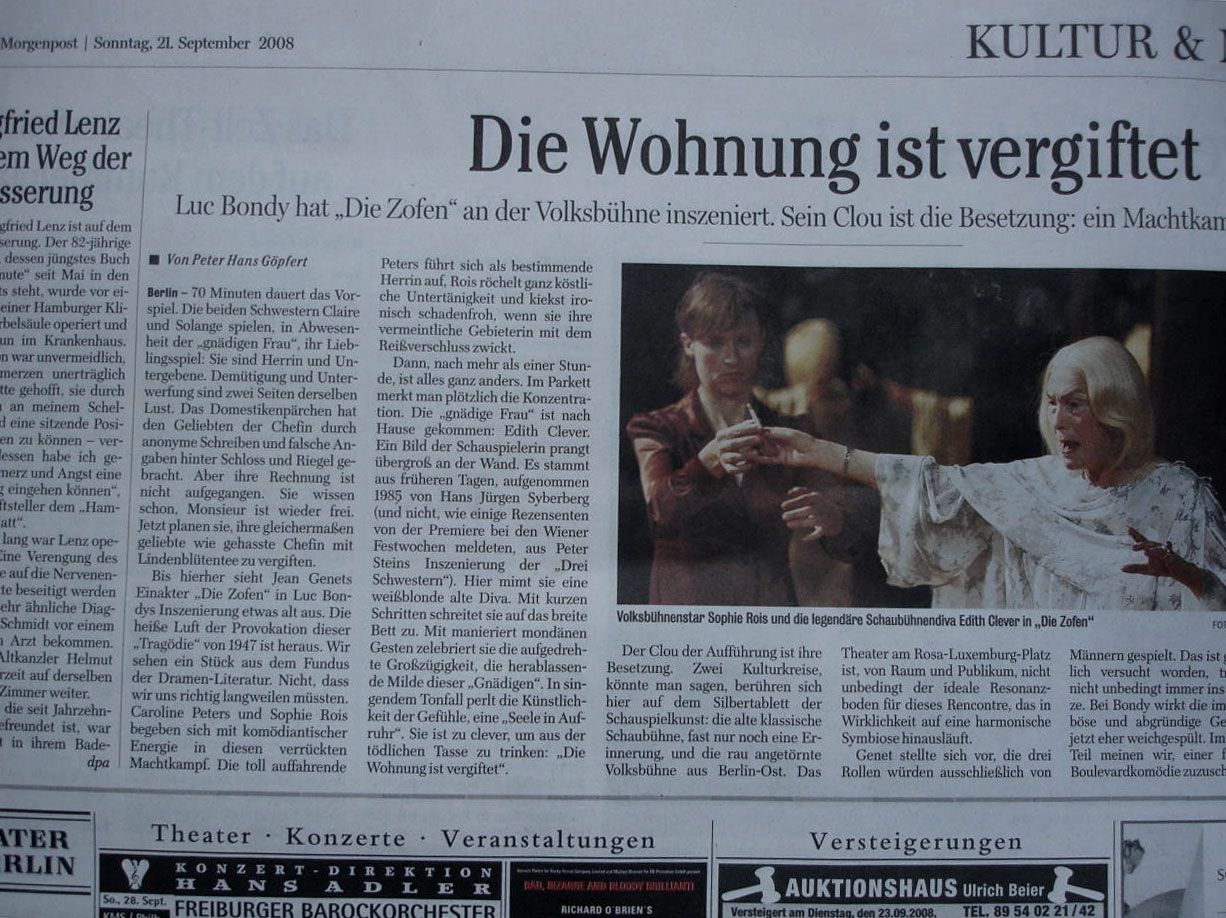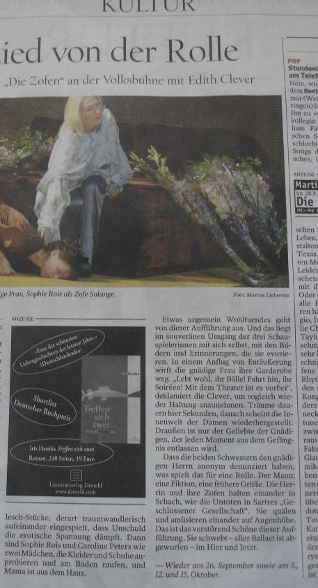Sophie Rois und Caroline Peters sind hier zu Hause. Für sie, für die mörderisch verdrehten, verfummelten und herrischen Schwestern im Dienst der „gnädigen Frau“, ist es ein Heimspiel. Sonst sind oder waren sie hier, in der Volksbühne, in Bert Neumanns Bühnenbildern, die Chefinnen. Und für die Gnädige, für Edith Clever, wird es eine Berliner Wiederkehr; die wievielte seit den großen alten, weit entrückten Tagen ihrer Schaubühne?! Edith Clevers Präsenz strahlt ebenso still wie triumphal – an einem Abend, der Ebenen und Reflexionen wunderbar leicht verwirrt und verschränkt. Eine so elegante Inszenierung von Luc Bondy sah man lange nicht.