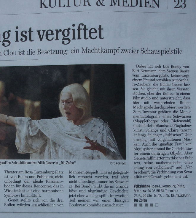 Anässlich der Wiener Premiere dieser Zofen im Juni nämlich hatten die deutschen Zeitungen, speziell FAZ und SZ, in hübschen Abhandlungen spaltenlang über das Zusammentreffen von post DDR-Volksbühne und west-Schaubühne aus der Besetzung mit EC und den anderen von der VB philosophiert. Und das wegen des übergrossen Bildes (3m) an der Wand der Bühne der EC von damals. Bert Neumann aber als Urheber des Bühnenbilds für den Schaubühnen Bondy wird mit einigem Hintersinn eben nicht ein Zitat der Schaubühnen EC genommen haben, sondern das der EC danach aus der Nacht(1984/85). Und diese Nacht schon, wie alles was hier folgte, war der schwierige Prozess einer bewussten Abwehr und Befreiung eben von der Ästhetik der Schaubühne unter sorgsamer Vermeidung dessen, was deren Erfinder heute macht. Das gab viel Verfolgung, von Seiten der damaligen Hüter des Betriebs, bei den Theatern in der Nachfolge der Schaubühne, wie von denen dieser selbst, bei den Leuten des Feuilletons bis heute, in der Form des Boykotts und der direkten Einflussnahme bei den Verantwortlichen mit ideologischen, rassistischen und ehrabschneiderischen Mitteln der Eliminierungsversuche. Es ist eben nicht so, dass hier Volksbühne gegen Schaubühne antritt, nicht so gemeint und nicht eigentlich. Alles ist viel interessanter.