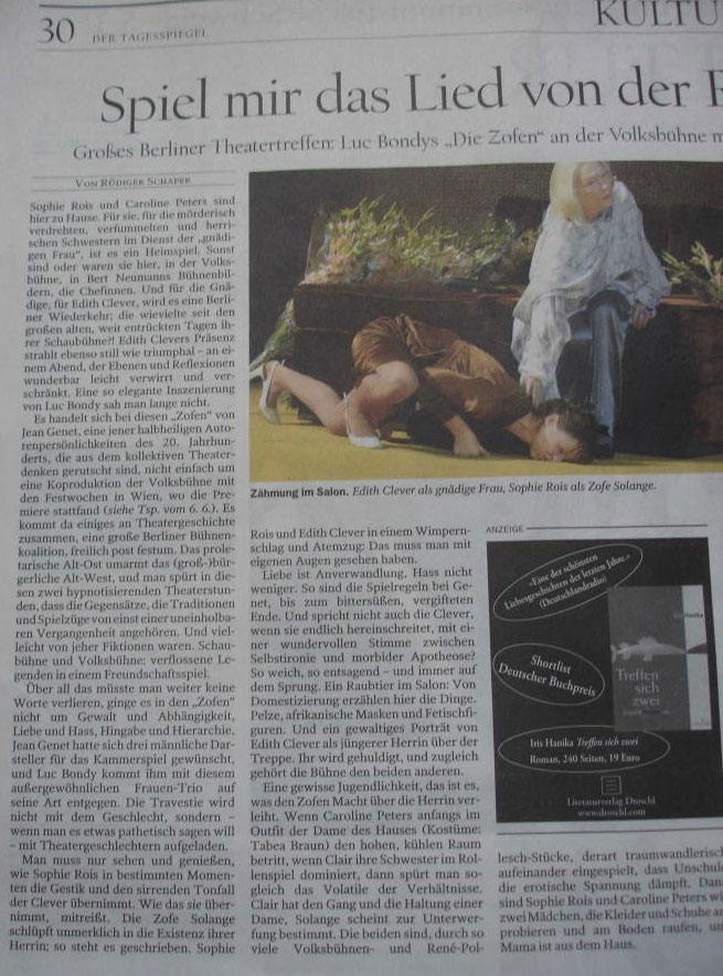 Es handelt sich bei diesen „Zofen“ von Jean Genet, eine jener halbheiligen Autorenpersönlichkeiten des 20. Jahrhunderts, die aus dem kollektiven Theaterdenken gerutscht sind, nicht einfach um eine Koproduktion der Volksbühne mit den Festwochen in Wien, wo die Premiere stattfand (siehe Tsp. vom 6. 6.). Es kommt da einiges an Theatergeschichte zusammen, eine große Berliner Bühnenkoalition, freilich post festum. Das proletarische Alt-Ost umarmt das (groß-)bürgerliche Alt-West, und man spürt in diesen zwei hypnotisierenden Theaterstunden, dass die Gegensätze, die Traditionen und Spielzüge von einst einer uneinholbaren Vergangenheit angehören. Und vielleicht von jeher Fiktionen waren. Schaubühne und Volksbühne: verflossene Legenden in einem Freundschaftsspiel.