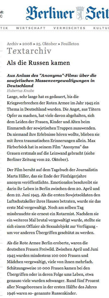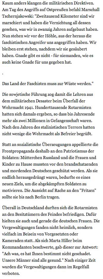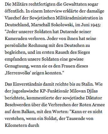 Die Massenvergewaltigungen werden oft bis heute als spontane Vergeltung fŸr die deutschen Verbrechen in Russland erklŠrt - und damit indirekt gerechtfertigt. Dabei wird Ÿbersehen, dass es sich nicht um vereinzelte Exzesse traumatisierter Soldaten handelte. In Wirklichkeit handelte es sich um systematisch verŸbte Verbrechen, fŸr die die damalige sowjetische FŸhrung die Verantwortung trŠgt.