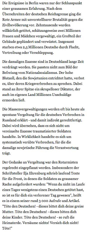 Der Gedanke an Vergeltung war den Rotarmisten regelrecht eingepflanzt worden. Insbesondere der Schriftsteller Ilja Ehrenburg schrieb laufend Texte fŸr die Front, in denen die Soldaten zu grausamer Rache aufgefordert wurden: "Wenn du nicht im Laufe eines Tages wenigstens einen Deutschen getštet hast, so ist es fŸr dich ein verlorener Tag gewesen", hei§t es in einem seiner rund 3 000 Aufrufe und Artikel. "Tšte den Deutschen! - dieses bittet dich deine greise Mutter. Tšte den Deutschen! - dieses bitten dich deine Kinder. Tšte den Deutschen! - so ruft die Heimaterde. VersŠume nichts! Versieh dich nicht! Tšte!"