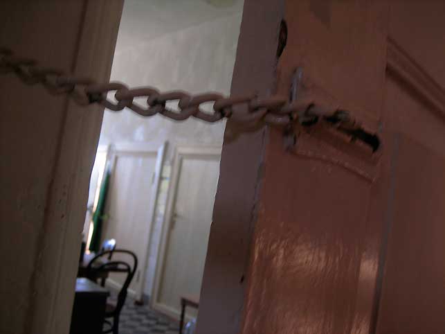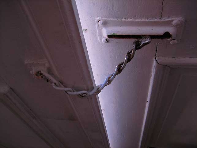 Diese Ketten als Türverriegelung aus Kindertagen blieben erhalten über ale DDR und LPG Grausamkeiten wie Kempowskis Spiegel am Küchen-Fenster zum Hof als er zurückkam, im Puff, den sie daran gemacht.