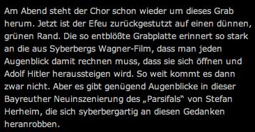 Was aber kann man den Presseberichten entnehmen. Viel von dem Kind, das sich durch das Geschehen zieht(siehe Parsifal Szenen im Vorspiel von 1981), von der Wichtigkeit des RW-Grabes(siehe Hitlerfilm Plakat und DVD cover1977), von der Wirksamkeit Wahnfrieds als Ort (siehe Winifred Wagner 1975)wie einer Erfindung für künstlerische Darstellung, Winifred selbst wurde entdeckt als Modell für Kundry