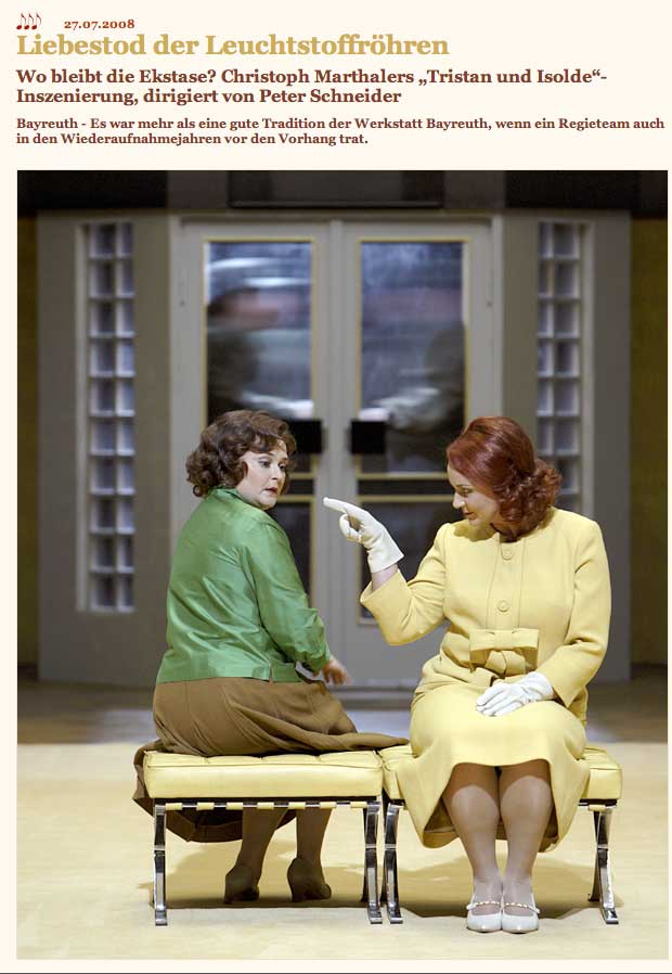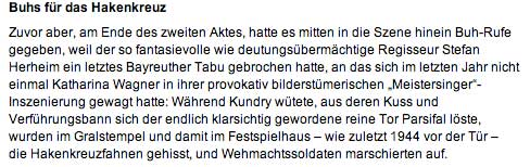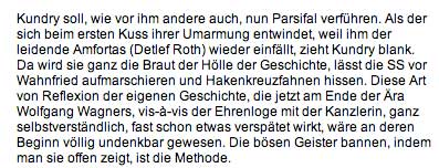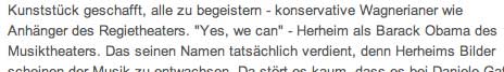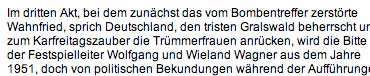H. Mayer, der alte Spielverderber, der des brecht und Richard Wagner, hätte wahrscheinlich dreingeschlagen, wie schon beim Sachs und Beckmesser vor einem Jahr, wie damals als er eine Theaterkarriere des vorauseilenden und gehorsamen Zeitgeist-Kollegen beendete, wie dieser Wagners Worte verballhornend ohne Musik auf die Bühnen brachte, um den Meister als aus Deutschland zu entlarven, aber die Generation der Emigranten kann sich nicht mehr wehren, wenns um ihren Wagner geht.