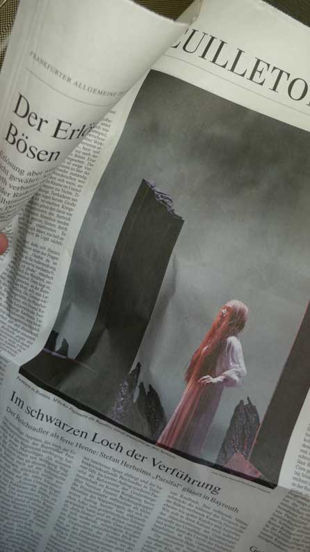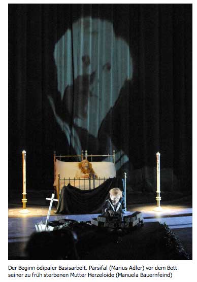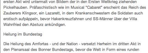 ( doch wohl eher nicht die Hitlerfreundin als Ahasver?)und das Bett als Zentrum, aus dem alles kommt(siehe ZEIT-Sonderheft zur WW 1975). Und wir lesen von und sehen Puppen(siehe Hitler und Parsifalvorspiel1977/81), oder dass das Orchester auf die Bühne gespiegelt wird (siehe Aue 1981)und immer wieder vom Bogen von RW bis H. und heute, als Schlüssel(Vorwort zur WW und überall in Kommentaren 1977), der Ludwigmantel des Titurel aus dem Ludwig hier für den Parsifal(?)wir lesen von Vorbildern und Verweisen auf Mel Brook oder Kabaret oder sogar Lars von Trier ohne Bilder lieferte( welch ein Fest für Programmheftehinweise zu den Quellen für die Dramaturgen und in der Zeitungen).