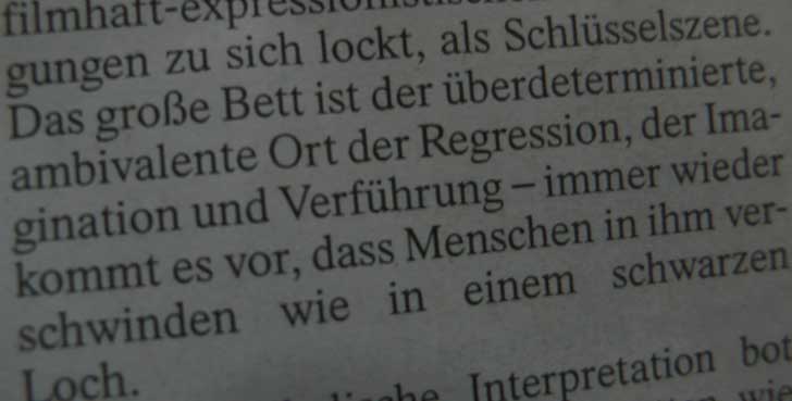 Oder wenn ein Bett so zentral in Bayreuth aus dem alles kommt gebraucht wie erfunden wird, warum nicht das in dem er gelegen bei jedem Besuch, der immer wirkt und anzurufen ist, wenn der Name Bayreuth fällt, vorhanden oder nachzubauen, wenn schon soviel nachgemacht wird, von Fassaden und Gebäuden aus dem Blut der anderen. Ein Eldorado für vergleichende Berichte der kenntnisreichen, wenn man sie duldet. Nicht der kritischen nur, auch des Erkennens, erduldend vielleicht, lösender.