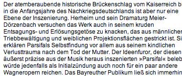 Man könnte auch sagen was die Amerikaner Bayreuth wünschten, Opperettenhaus zu werden, indem sie in die Ecken der Bühnen und sonstwo schissen, ist nun weithin eingeholt durch feierliche Selbsterlösung bunt und laut lachend alle.
