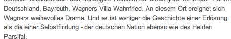Sie hatten mich gefragt, ob ich nicht den Zyklus meiner unter dem Zeichen RW vereinten DVD Filme von Ludwig bis Parsifal und Hitler drin und die Frauen inkl. WW die aber nun die Originale als eine Box in Bayreuth zeigen wolle, wohl zu vereilig. Im Museum, wie sie Wahnfried nun nennen, und irgendwann, im liebsten nicht zur Festspielzeit, wenn alle weg sind, die hier mit fakes Erlösten. Ich glaube, das lassen wir lieben uns allen ersparend, das wäre jetzt falsch, fehl am Platz. Wie man so sagt. Alle sind so frohgemut, dass niemand weiss wovon.