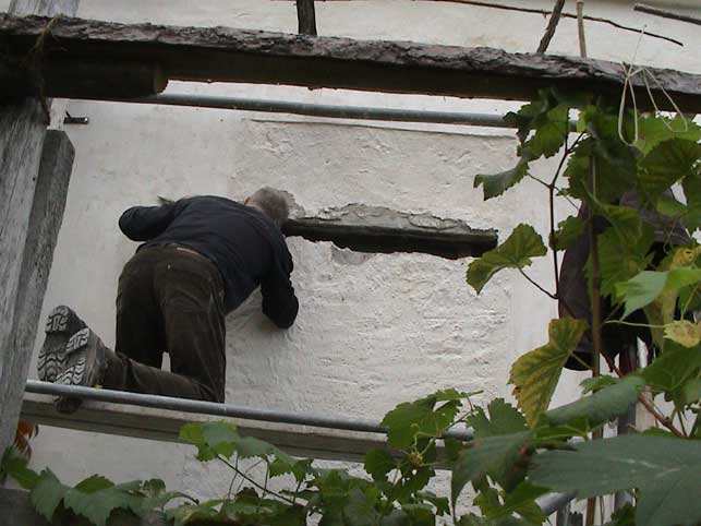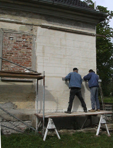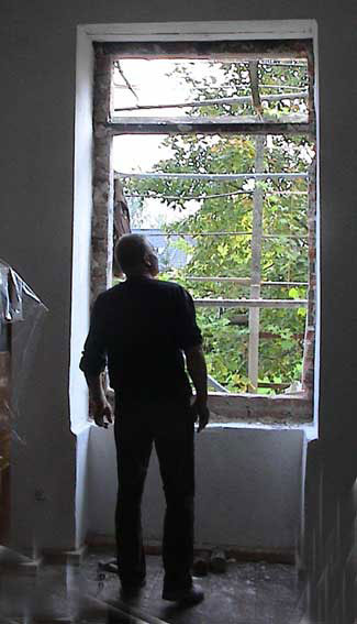 Die Pfeiler sind vom ihm, als erstes. Und die Fassade,des Hauses und die Wände, Türen, Fenstermauern, immer, wenn es was zu mauern gab. so auch die neuen Öfen im Büro sein Meistestück und den im Prinzessinnenzimmer, die Böden und Pflasterungen. Die Kirche als Ausflug nicht zu vergessen.