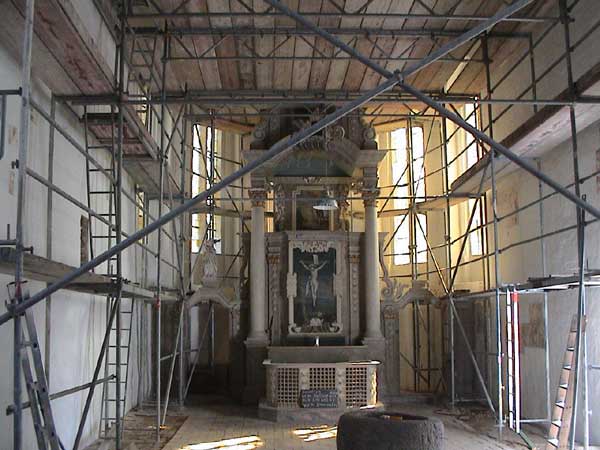 seit Wiederbegenung mit diesem Ort der Geburt und Kindheit versuchen wir die damals geschlossenen Kirche wieder zu beleben. Der Chor ist schon wieder entstanden und die Kirche wieder offen. So das Dach gesichert und die tragenden Balken.