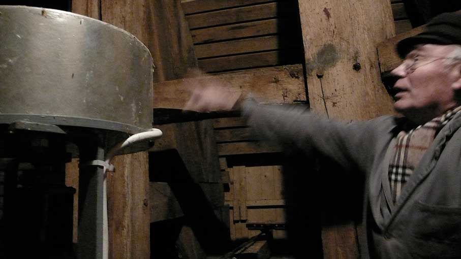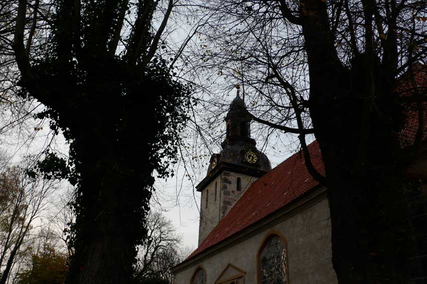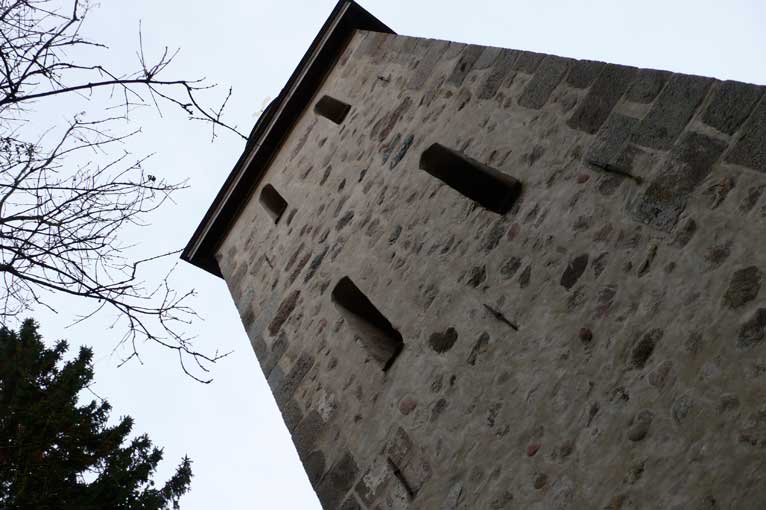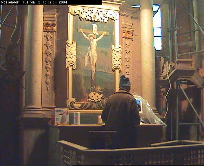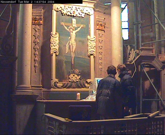 In Nossendorf war dergleichen Glück nicht beschieden. Eine Generation genügte, von der Zeit geschlagen alles zu verlieren, was einmal ihrs war, nun als Volkseigentum Raubbau an sich. Die Häuser und Menschen, so die Kirche, und der Turm sichtbar gekappt ohne Verlustgefühl. Als ich wiederkam versuchten wir, gegen die Entscheidung der Kirchenleitung in Greifswald die Kirche wieder zugänglich zumachen. Mit Hilfe der örtlichen Stellen aus der Kirche selbst und mit den Teams aus dem Hause hier, als Filmteam gewerblich offiziell erlaubt und ohne Gewinne für das Geschäft, gerade noch finanziell möglich in persönlicher Sorgfalt aus dem Dorf selbst alle nach dem Gewerbe, das sie alle ergänzend beherrschen. Der Chor wurde neu gefasst, Wandmalereien aus dem Mittelalter in Fenstern der Wandbemalung freigelgt. Aber das Hauptschiff notdürftig mit Plastikdecke bespannt ist noch zu ergänzen und die Orgel nicht wieder erworben, obwohl sie schon wartet. Der Turm aber soll als nächstes Zeichen geben, dass wir nicht aufgeben, was verloren war und was zusammengehört. Noch versuchen die Menschen den Weg zur Kirche mit privaten Auffahrten und Zäunen zu versperren gegen die, die kommen hier etwas zu tun, für alle. Die Kameras werden weithin künden, wie es des Turmes Brauch ist nun über das Internet, was hier geschieht, weltweit aus kleinem Ort und wie es soll. Dass ein Turm wieder entsteht, der zu nichts nütze ist als dazu sein und zu künden in grösseren Zusammenhang, historisch und geographisch, dass wir es sind und sonst als alles. Das wirs waren. Wie Orgeln für viel Geld und anderes. Wenn wir das aufgeben, geben wir mehr auf als den Turm einer Dorfkirche von Pommern und seiner Wege dorthin.