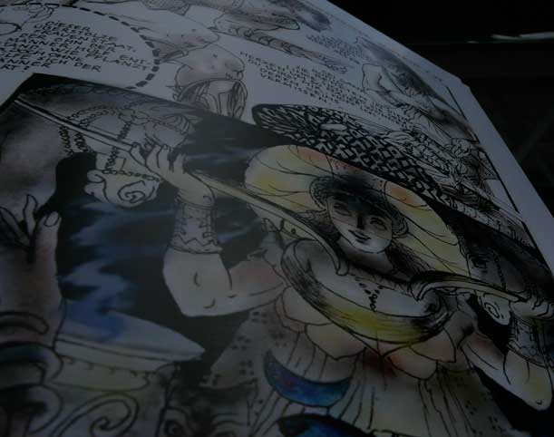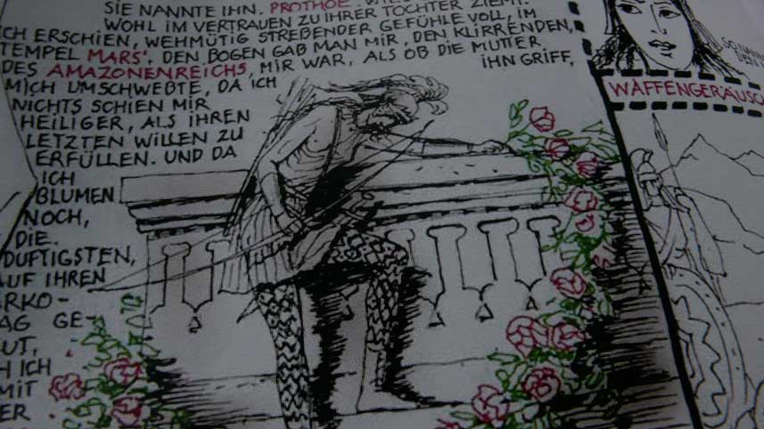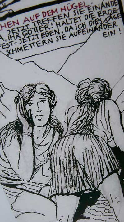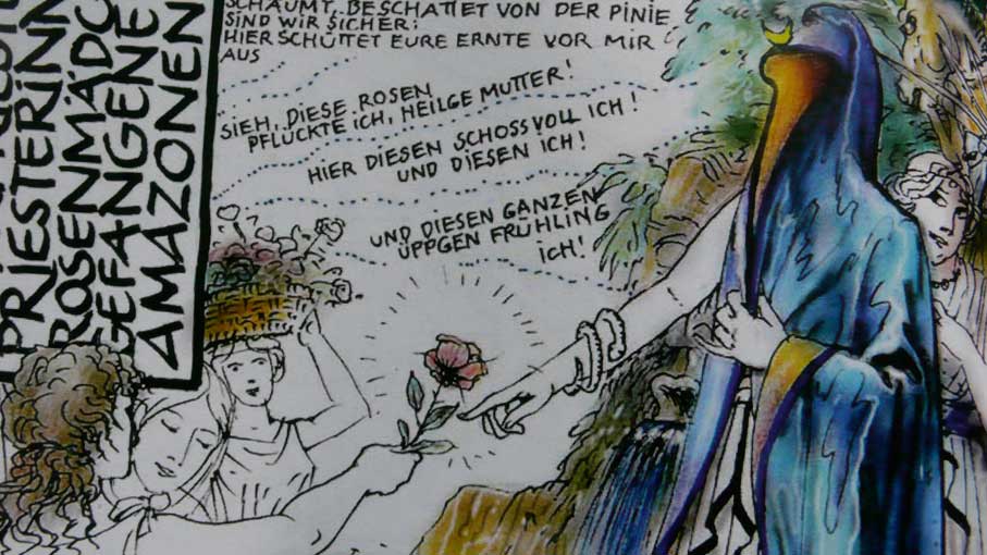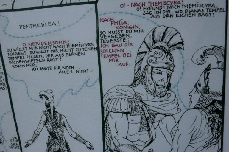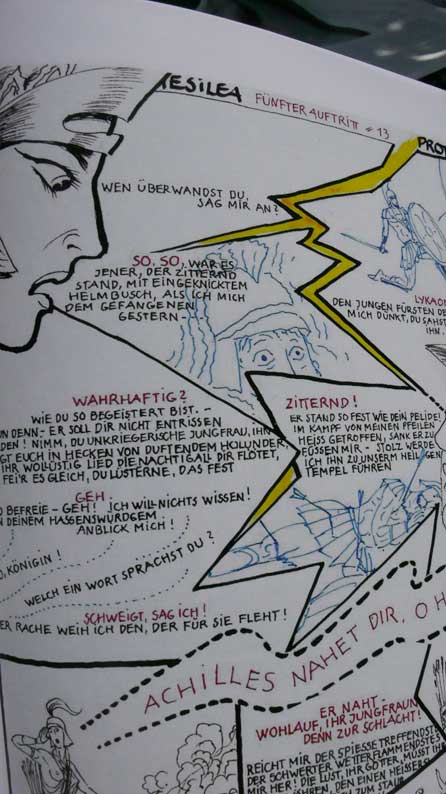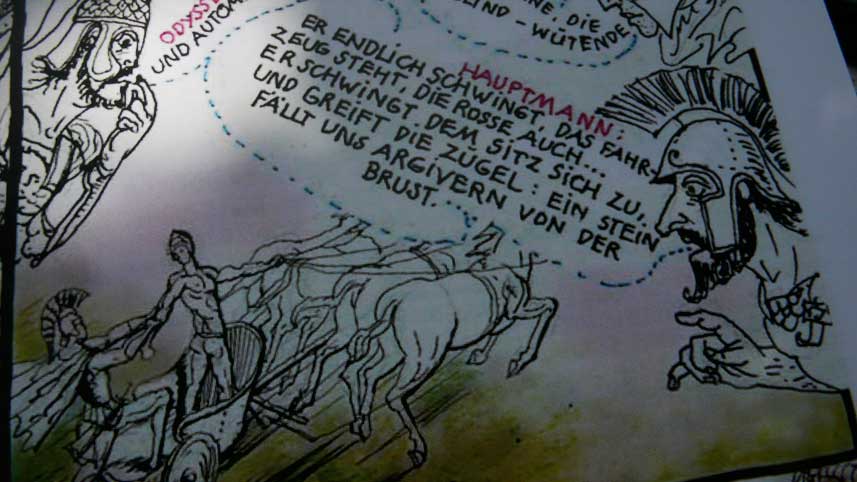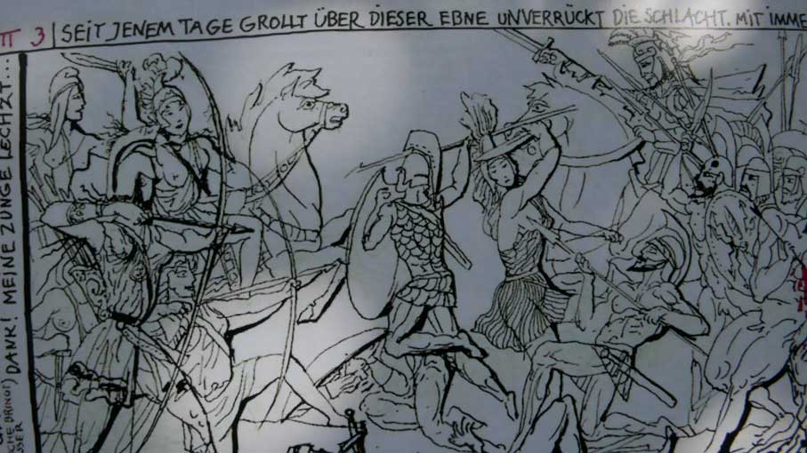 Was der Bühne unmöglich, dem Film nicht erlaubt und im Monlog vorgestellt ist, kann auf dem Papier wieder gezeichnet werden. Nach filmischem Wissen und aus Doumentierung der Worte, entsteht das optische Skript der idealen Bühne.