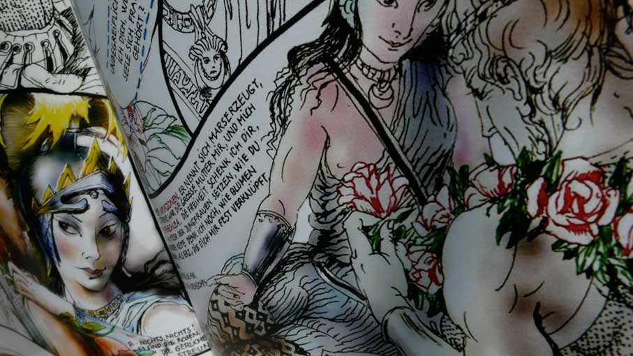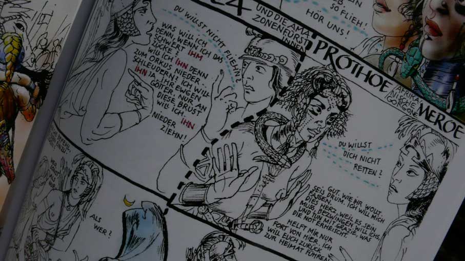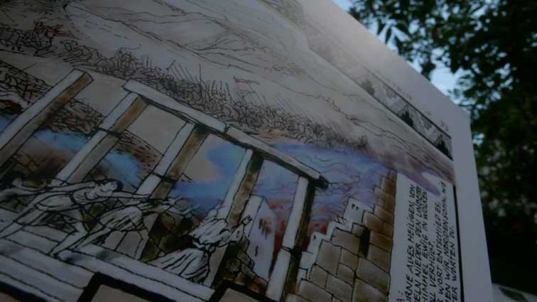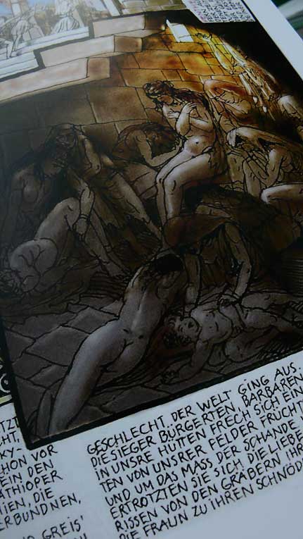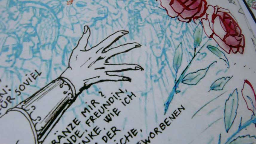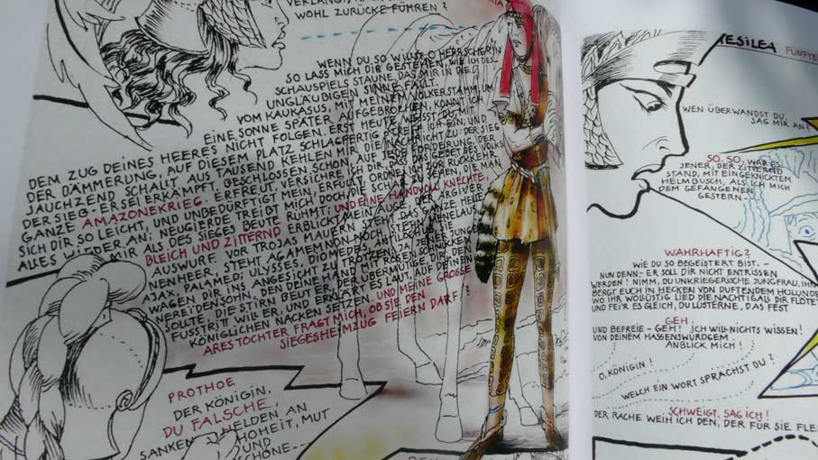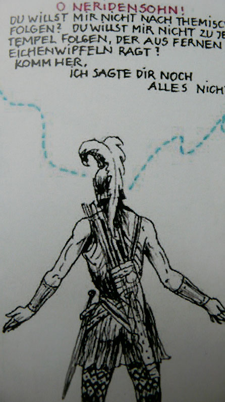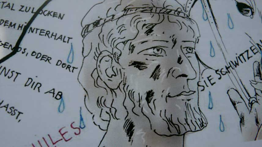 Was der Bühne unmöglich, dem Film nicht erlaubt und im Monlog vorgestellt ist, kann auf dem Papier wieder gezeichnet werden. Nach filmischem Wissen und aus Doumentierung der Worte, entsteht das optische Skript der idealen Bühne.