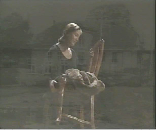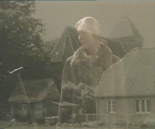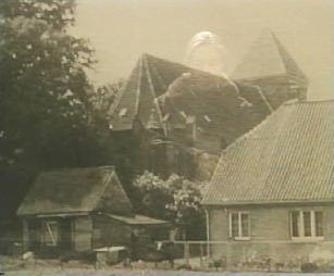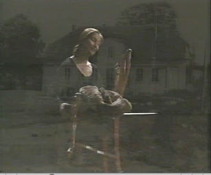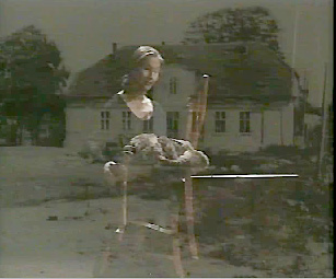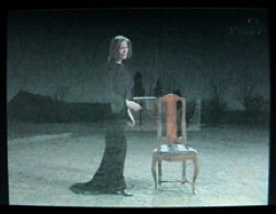 Im Traum-was sonst- wird dieser Stuhl durch den Film und auf der Bühne oft als einziges Requisit hindurch getragen. Am Ende dazu die Projektionen von Nossendorf, den Ort der Herkunft, durch die Geschichte der Veränderungen von vor 1945 bis 1989 der Wende. Hier -oben- der DDR-Zustand der Fassade. Und das ist das erste Bild des Endes.