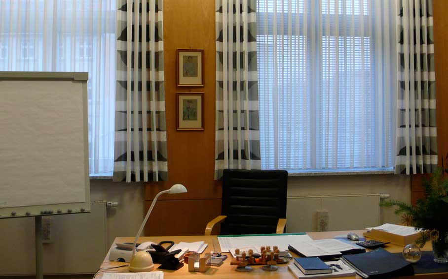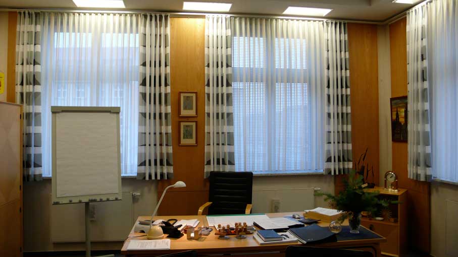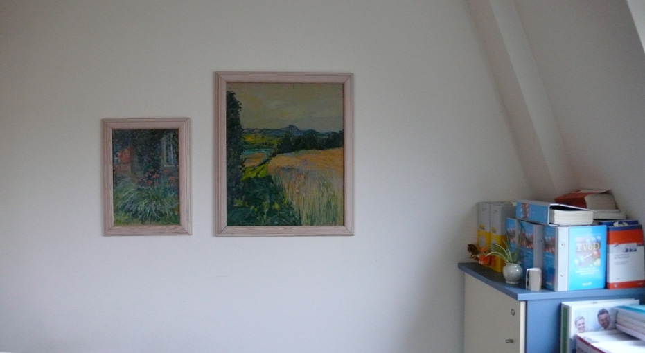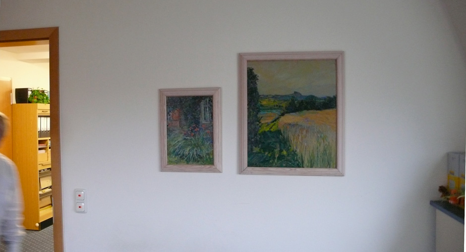 Sie hängen dort zwischen den fenstern und gegenüber dem Schreibtisch das dritte. Das Tageslicht ist an diesem Tag auch mittags sparsam, dass ungünstiges, gelbes Kunstlicht helfen muss.