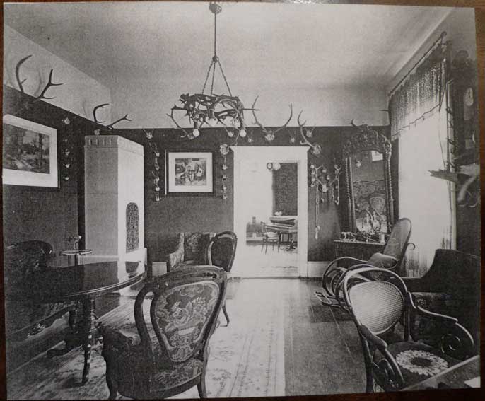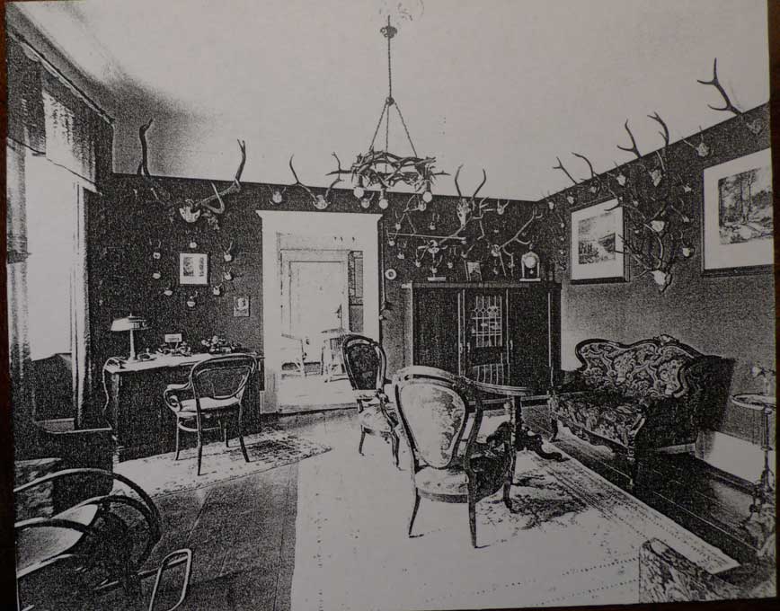 Die Geweihe im Herrenzimmer. Intakt noch die Rahmen der Türen aus der Erbauungszeit fest geordnet alles. Aber der Ofen war schon bei uns nicht mehr da.