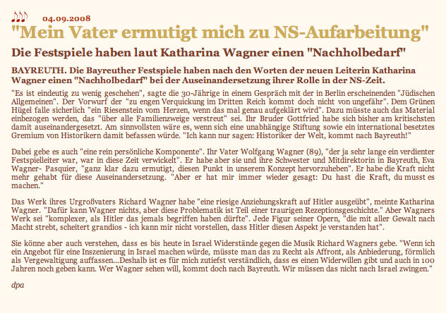 Es wird sich erweisen, wie sehr in dieser Geschichte eines Zentrums der Kunst Motive der Familiengeschichte zum Spiegelbild der Reiches wurden und der Geschichte danach. Gut fassbar und als Quelle ergiebig, für den der hier ansetzt. Psycho-Anlalyse, Geschichte und Musik/Wort/Philosophie(Nietzsche) als Einheit. Aber "geistiges Geschwafel"(Katharina) der Worte werden alleine nichts ergründen, und letzte Bühnenversuche in Bayreuth werden nicht zu Erkenntnissen führen oder heilen. Alles andere an diesem Modell RW wurde bisher abgewiesen. Und so ist der Alte von Bayreuth jetzt und seine lange Laufzeit, von allen gewollt, ein gutes Beispiel dafür, dass man es so wollte.