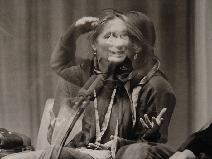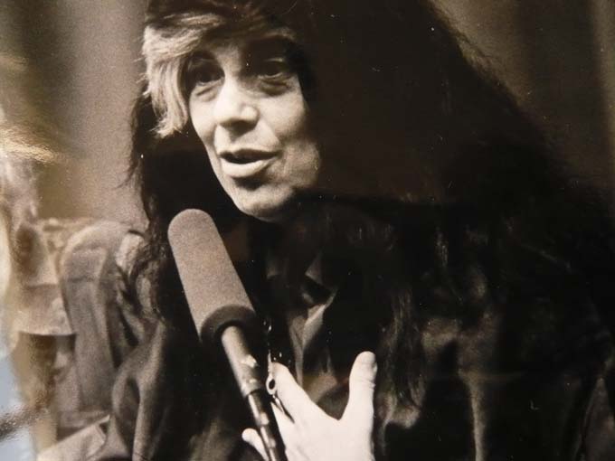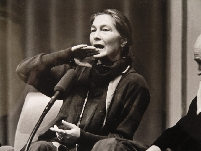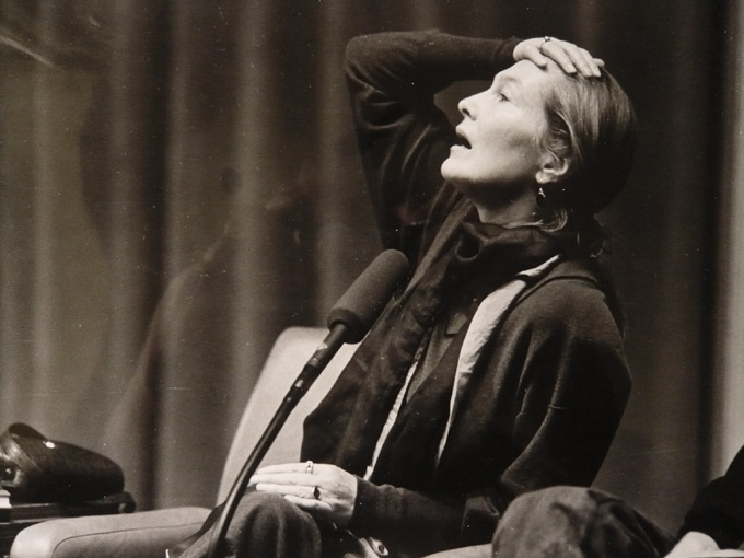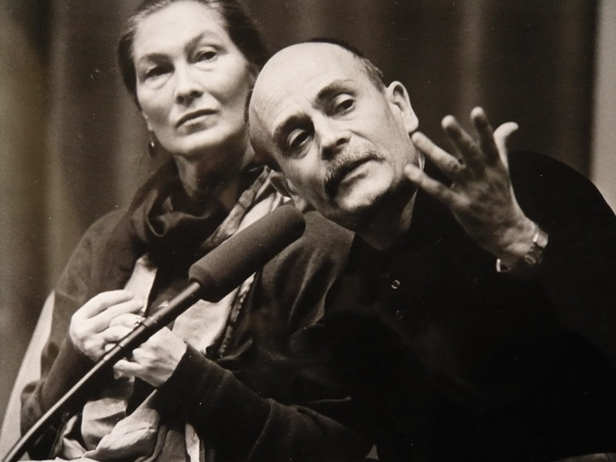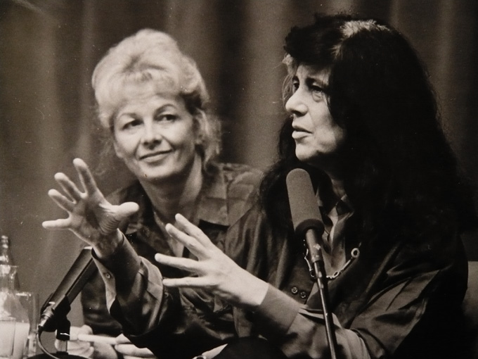 Im Oktober 1990 war diese Veranstaltung von Heiner Müller, dem damaligen Präsidenten der Akademie im Osten, nach der Vorführung des HitlerFilms einberufen worden. Auf dem Podium der ehem. Volkskammer der DDR(vor dem sog.Pal der Rep.)sassen nun -wie hier auf den einzigen Bildern von Hans Pölkow dokumentiert- Susan Sontag, die Freundin aus NY, Bernhard Sobel, der Freund aus Paris , Edith Clever, an den zwei vorhergehenden Abenden Penthesilea und Marquise zusammen 8 Stunden hinter sich, W. Stötzner, der Bildhauer, diese Eindrücke wiedergebend, Mittenzwei der Brecht-Herausgeber, Theweleit, ohne zu wissen, was Penth/Marquise sind, und wovon er sprach,