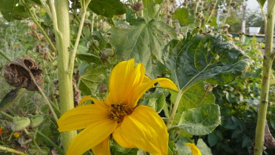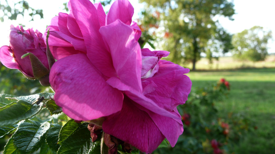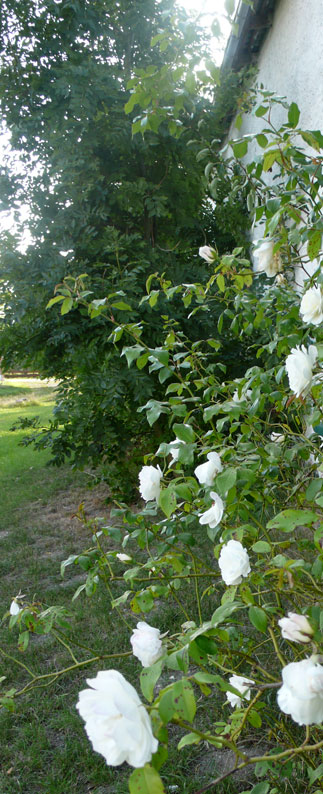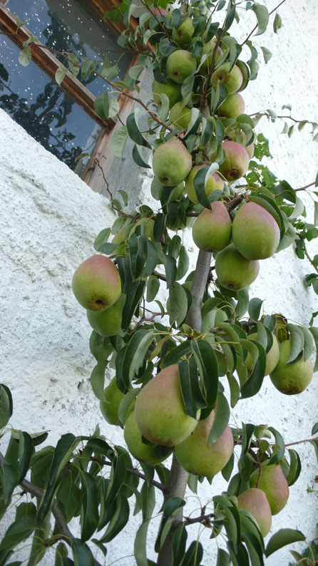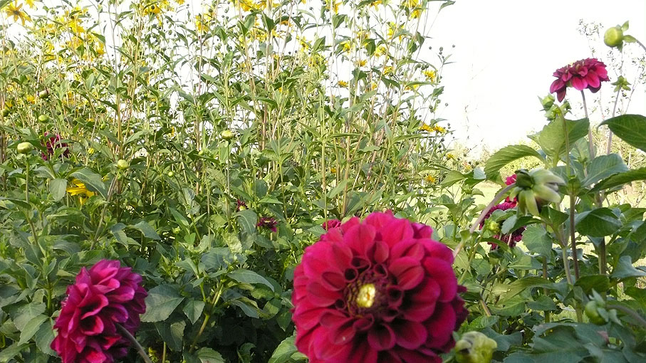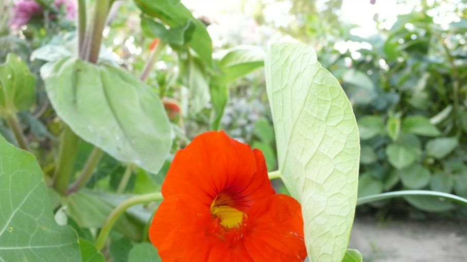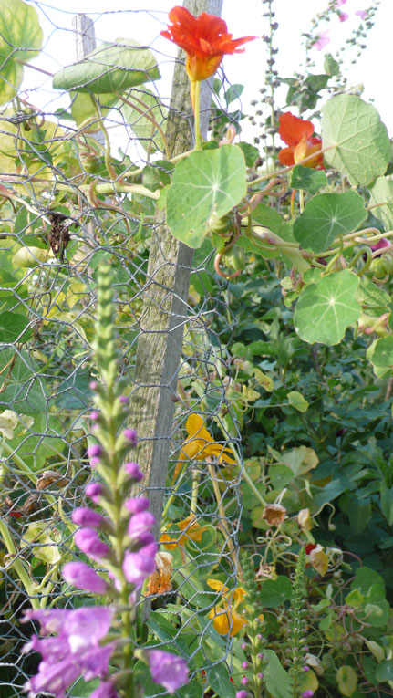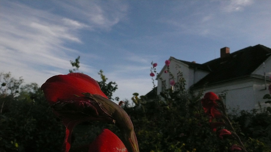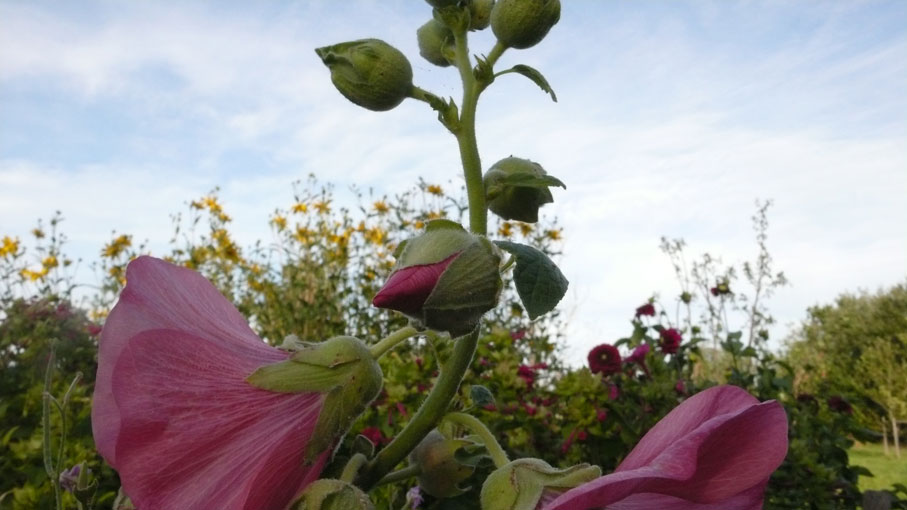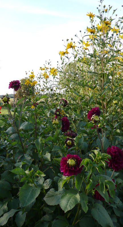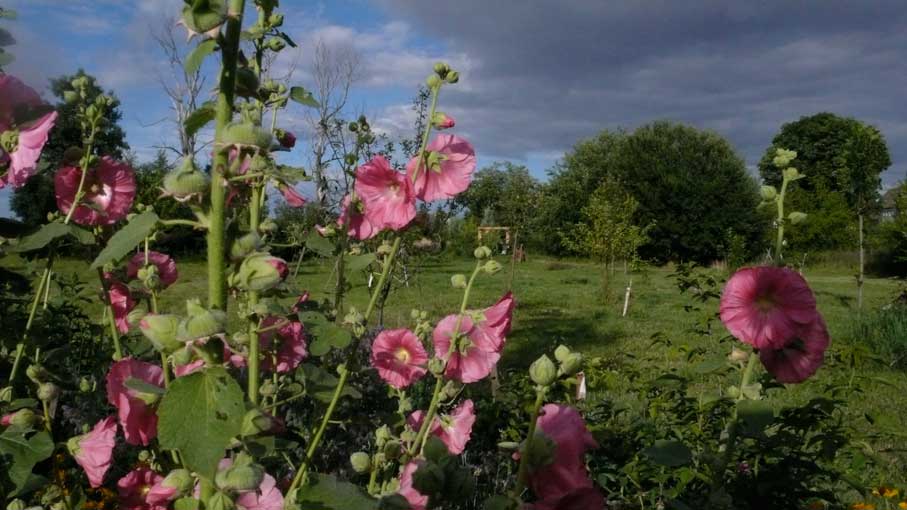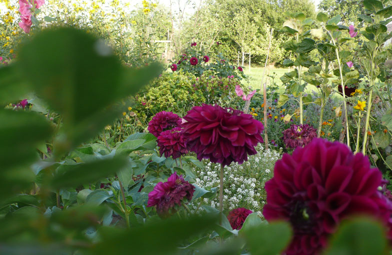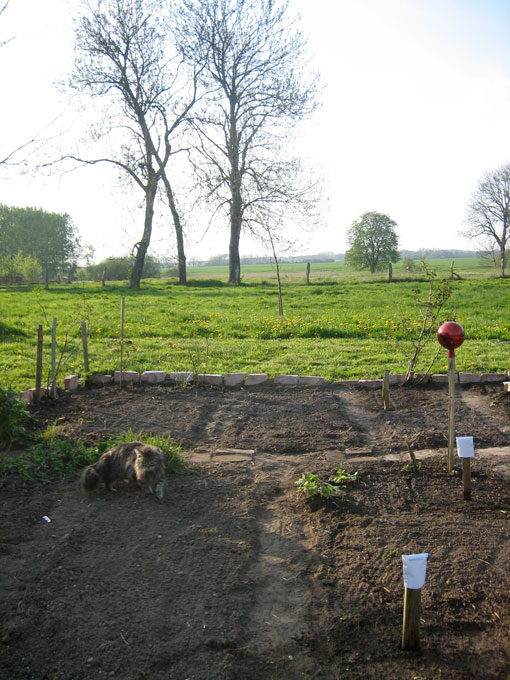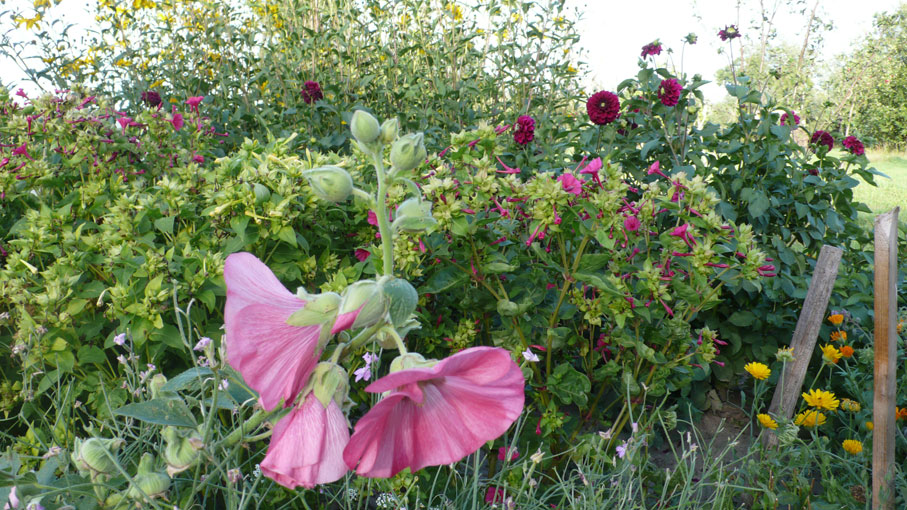 Erbsen, Bohnen, Kohl, Salate, - Kartoffeln? gehören aufs Feld, - Spargel Himberen und Stachelberen Johannesberen, alles das gibts im Supermarkt, Discounter doch billiger, einfacher von den Maschinen. Also Blumen und da möglichst die, die man nicht auch kaufen kann. Die sie nicht verkaufen, wie die Äpfel, die sie nicht führen, weil von hier, Nun sind sie in voller Blüte.