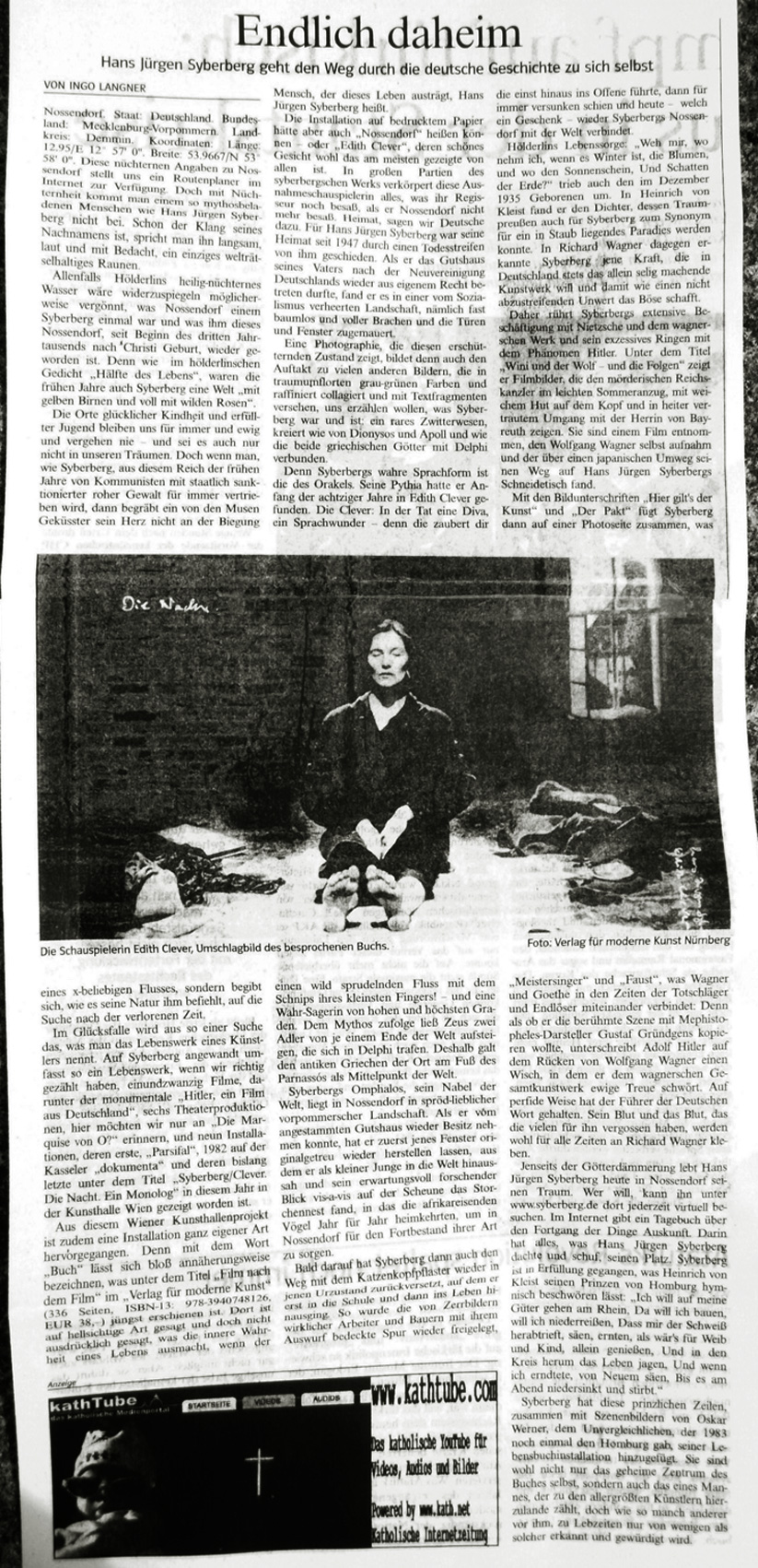 Die Installation auf bedrucktem Papier hätte aber auch „Nossendorf“ heißen können – oder „Edith Clever“, deren schönes Gesicht wohl das am meisten gezeigte von allen ist. In großen Partien des syberbergschen Werks verkörpert diese Ausnahmeschauspielerin alles, was ihr Regisseur noch besaß, als er Nossendorf nicht mehr besaß. Heimat, sagen wir Deutsche dazu. Für Hans Jürgen Syberberg war seine Heimat seit 1947 durch einen Todesstreifen von ihm geschieden. Als er das Gutshaus seines Vaters nach der Neuvereinigung Deutschlands wieder aus eigenem Recht betreten durfte, fand er es in einer vom Sozialismus verheerten Landschaft, nämlich fast baumlos und voller Brachen und die Türen und Fenster zugemauert.