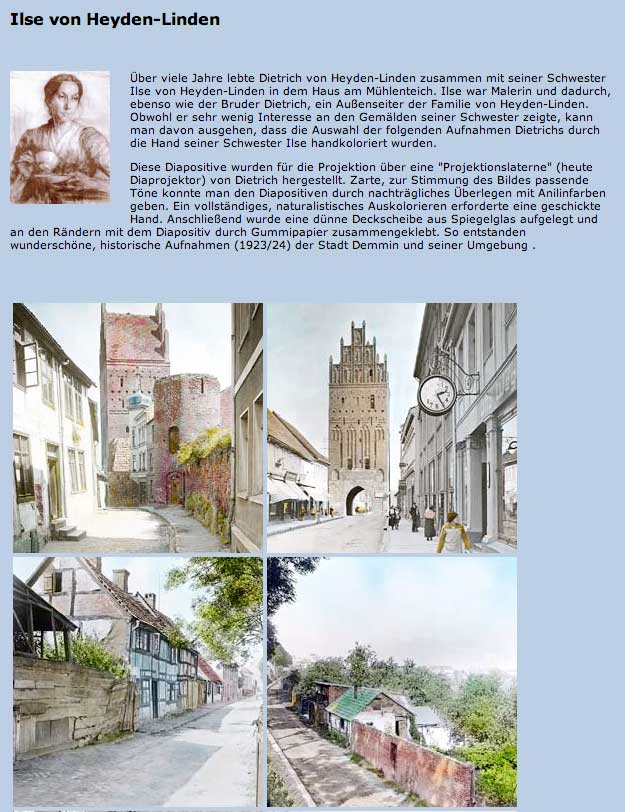 Aussen sind die Profile der Fenster und Fassaden noch gerettet, ein Fest aller Freunde, die es lieben. Das Heimat Museum in Demmin sucht seit Jahren kläglich ein Platz. In allen Darstellungen von Demmin wird Ilse von Heyden Linden als das berühmteste Kind der Stadt genannt.