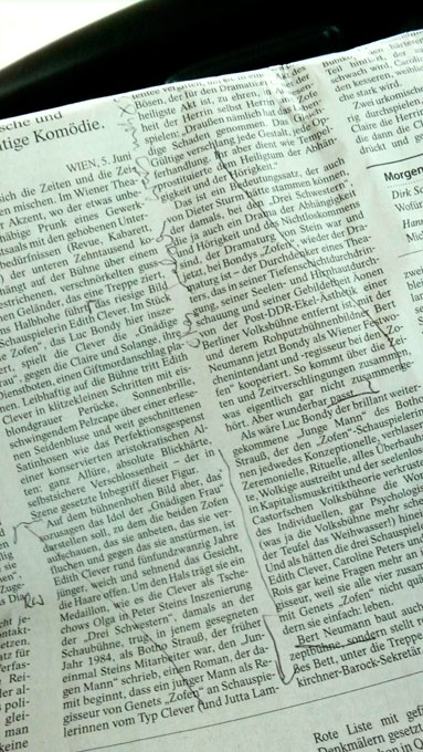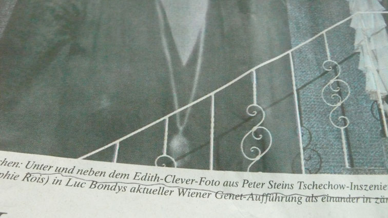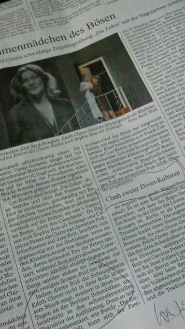 3 Meter hoch also die Bühne dominierend wurde von FAZ und SZ als Zitat von der Schaubühne und Peter Steins 3 Schwestern in genauen Details beschrieben. Und eben nicht als schlechte Arbeit der Bildredakteure in der Unterschriftenabteilung, denn das Bild ist nicht eines von der Schaubühne. In der FAZ wird daraus eine 4 Spaltenkritik mit langem Aushollen bis Botho Strauss(über Schaubühnen-Roman hier), Dieter Surm,(Dramaturg Tschwechow und Genet), zu Peter Steins und Luc Bondy. In der SZ wird ein System Volksbühne gegen Schaubühne als Clash daraus gemacht.