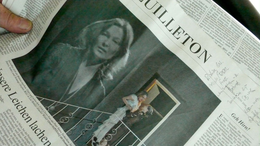 Das Bild aber stammt von Bert Neumann -erbeten, und sicher nicht ohne Grund aus der Nacht- und gehört zu einem Kapitel aus den Briefen Richard Wagners an die Frauen, hier an Judith Gautier mit folgendem Text ".. leide nicht, leide nicht, liebe einzig." Nie hat die Schaubühne Gelegenheit gegeben einen vergleichbar hier zu beobachtenden Ausdruck zu entwickeln. Selbst fehlender Quellenhinwies im Beiheft der Aufführung in Wien dürfte also nicht zu diesem Irrtum einer Verwechslung der Zeitungen geführt haben. Die Interpretationsgeschichte und der Öffentlichkeitsbetrieb lebt von stilistischen Deutungsversuchen und guten und schlechten Findern oder solchen Systemen der Interpreten. Ein so gesprochener Text, der solche Pausen zulässt und mit solch forderndem Blick endet. Unerbittlich in der Trauer. Es ist ein von einem Mann geschriebener Text an eine Frau -heuchelnd, wie sie wohl damit gebieterisch sagen will- , von einer Frau dargestellt. Die Antwort ist gleich mit drin, wenn er ihr solches schreibt - von ihr gesprochen. Die Antwort darauf wieder gibt die Nacht dessen, der sie so besetzt und wollte. Auf der Schaubühne - nie. Eben darum gab es die Nacht. Und anderes wie so nur hier. Das wäre zu vermelden -gewesen- vor mehr als 2o Jahren.