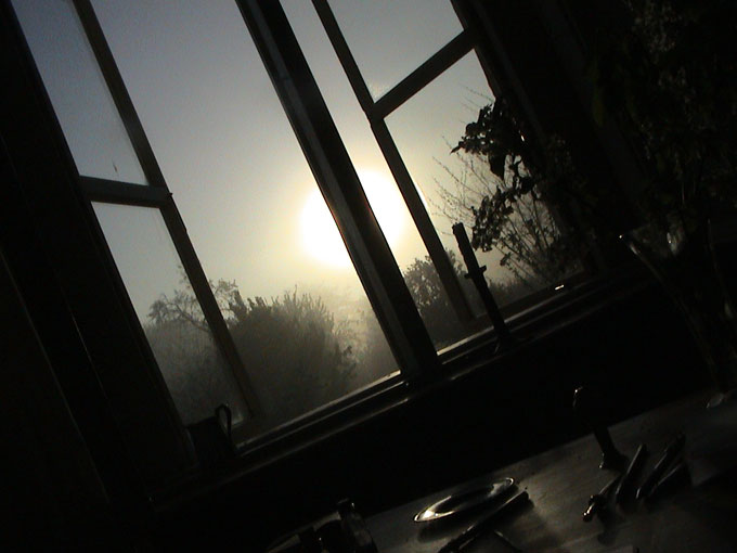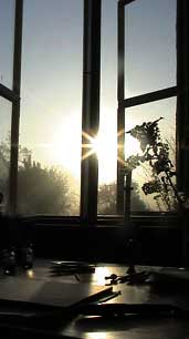 dies letzte Fenster der Fassade vorne rechts von ihm aus gesehen wollte er immer aufhaben. So gehöre es. Auf sein Drängen, wie so oft gewagt. Nun alle offen und gar nicht anders zu denken. Da wo wir sitzen nun immer zu ihm rüberschauend.