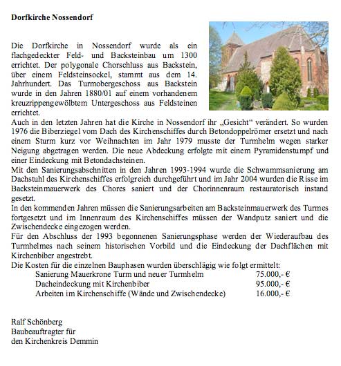 Der alte 96jährige Bauckmeier, der damals 1979 den Abriss und die Errichtung der neue Turmspitze in Nossendorf überwachte, erzählte bei unserem letzten Treffen vor seinem Tode von der Gefährdung des Turms in Demmin, und wie Nossendorf geopfert wurde als Gegenleistung, die Kirche in Demmin zu retten.