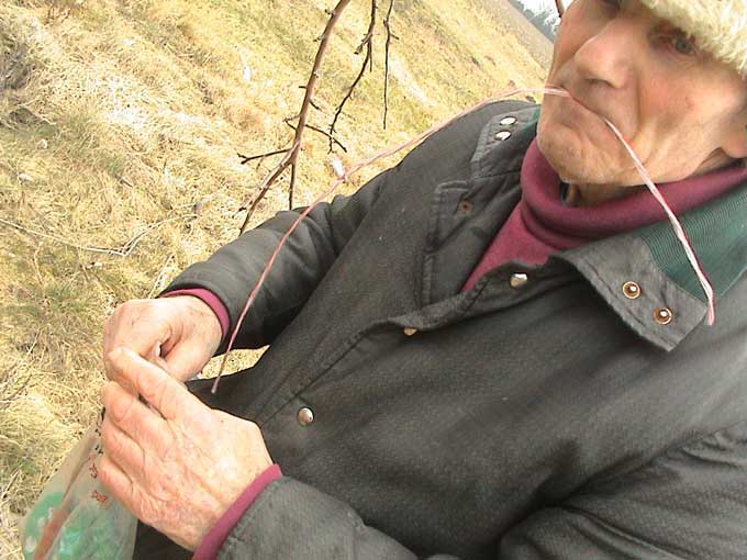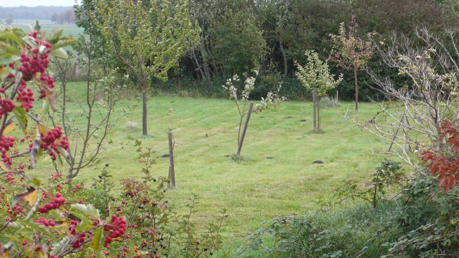 Vor 4 Jahren war ich bei Euch und hab den Karl Schuck, den Mann dann, besucht. Viermal, um von den Apfelbäumen aus unserem Garten und Park die Reiser zu holen, die er sich aus Reisern selbst gezogen. Er wusste, dass er wohl vor uns gehen wird und vertraute mir diese Erbschaft, nun von ihm, an. Es war ein kalter Januartag am 24.Januar 2004, klamm die Hände und mit langen Fahnen der Atem. Die Namen schrieb der Karl auf die verschiedenen Bündel. dass ich sie hier überwintern lassen konnte, am Fuss der abgerissen Pferdeställe, im Sand. Die Reiser wurden im Frühjahr wie empfohlen in Kleinzettelwitz auf junge Bäume gepfropft, aber nicht alle gingen an. Gerne wollte ich diese fehlenden nochmal nachholen. Zu einem neuen Versuch. Der Karl Schuck kam dann auch zu uns und wir versuchten hier in Nossendorf am alten Baum zwei neue Reiser aufzusetzen. Aber beide wuchsen nicht an. Auch diese sollten nochmal versucht werden. Es wäre schade unsere bei Euch auf wunderbare Weise überlebenden Bäume und Apfelsorten nicht wieder hier zu haben. Da kommen sie her und da gehören sie hin. Dafür bin ich da und zurück gekommen. So setzen sich die Dinge verwandelt fort und mit jedem sein Teil darin. Der Karl und ich waren uns da ganz einig. Das wächst sich nun schon wieder zusammen, wie es früher war uns allen bekannt von damals. Sollte mir in der Kälte auf dem Wege, extra zu Fuss diesmal, beim Fototgrafieren Eures Hauses und der alten Chaussee der Kirschbäume von damals, in der Kälte ein Bündel Reiser, wie ich von Martin höre, runtergefallen sein, ohne dass ich es merkte, gehört auch das ersetzt. Nur bitte ich um eine kleine Nachricht. Bis dahin.