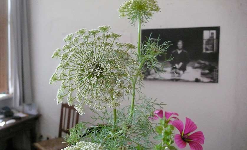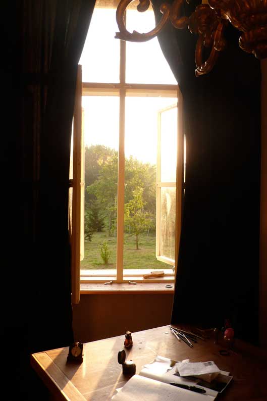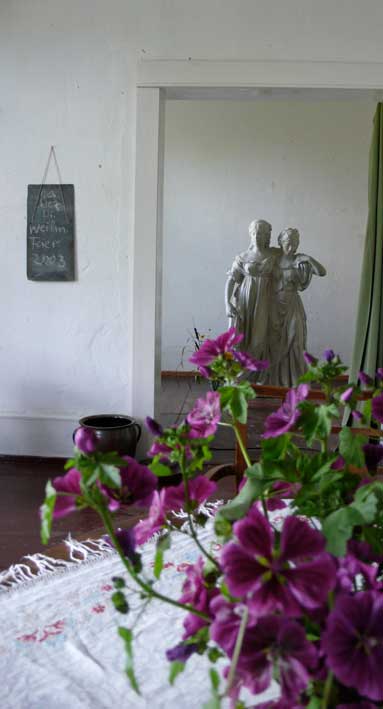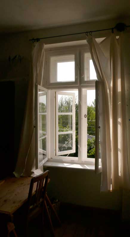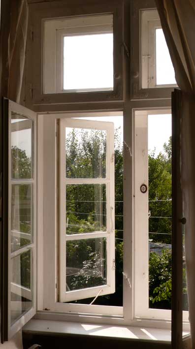 Die Zimmer des Kindes mit Blick in Richtung der L.Schrade Mutter und Tocher-Haus damals heute wieder, aber Haus in anderer Besetzung und Fenster des Vaters damals. Das Grün weich und morgendlich frisch.