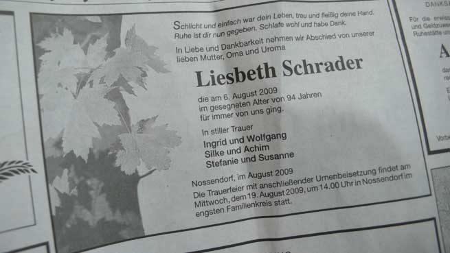 Ihre Tochter Lieselotte war unzertrennlich mit dem Jungen damals. Heute lebt sie schräg gegenüber neben der Kirche über die Strasse. Mit der Mutter zerstritten bis zur Trennung.