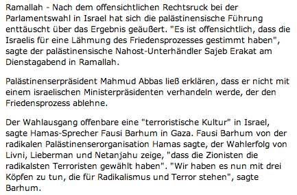Reich rechnerisch könnte Netanjahu einer solchen Rechts-Koalition als Premier vorstehen. Doch das wäre das Ende jedes Friedensprozesses. Die rechtsgerichteten Parteien sind gegen die Gründung eines palästinensischen Staates, gegen die Aufgabe von Siedlungen im besetzten Westjordanland und gegen die Rückgabe der Golan-Höhen an Syrien.